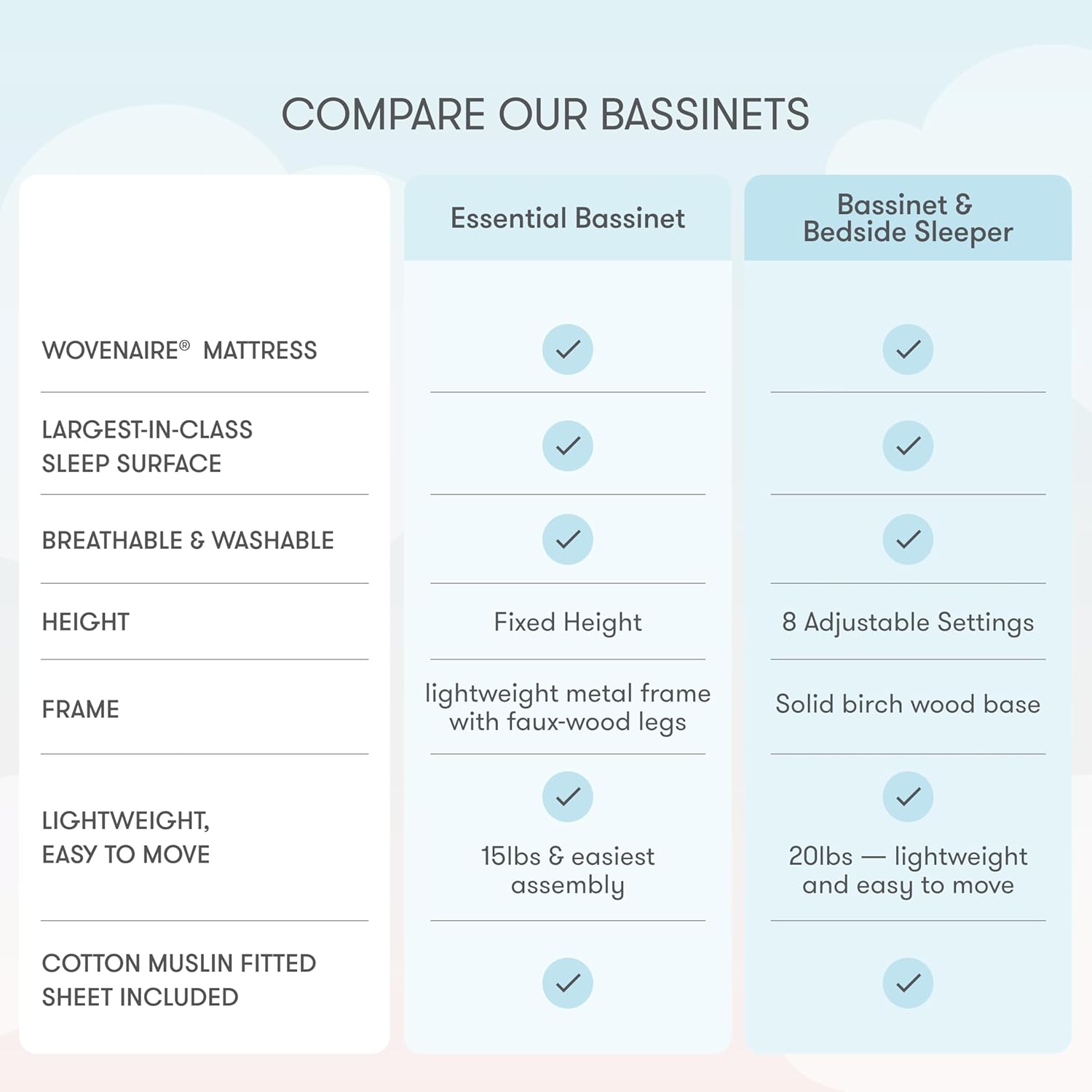 - ADDITIONAL STORAGE: Fit with a mesh storage shelf below the sleeping area, our essential bassinet ensures that all of baby’s accessories can be just an arm’s length away. Whether it's wipes, diapers or toys, keep your favorites close by with this bassinet. NOTE: The Essential Bassinet is not height adjustable, and does not have added bedside sleeper functionality.