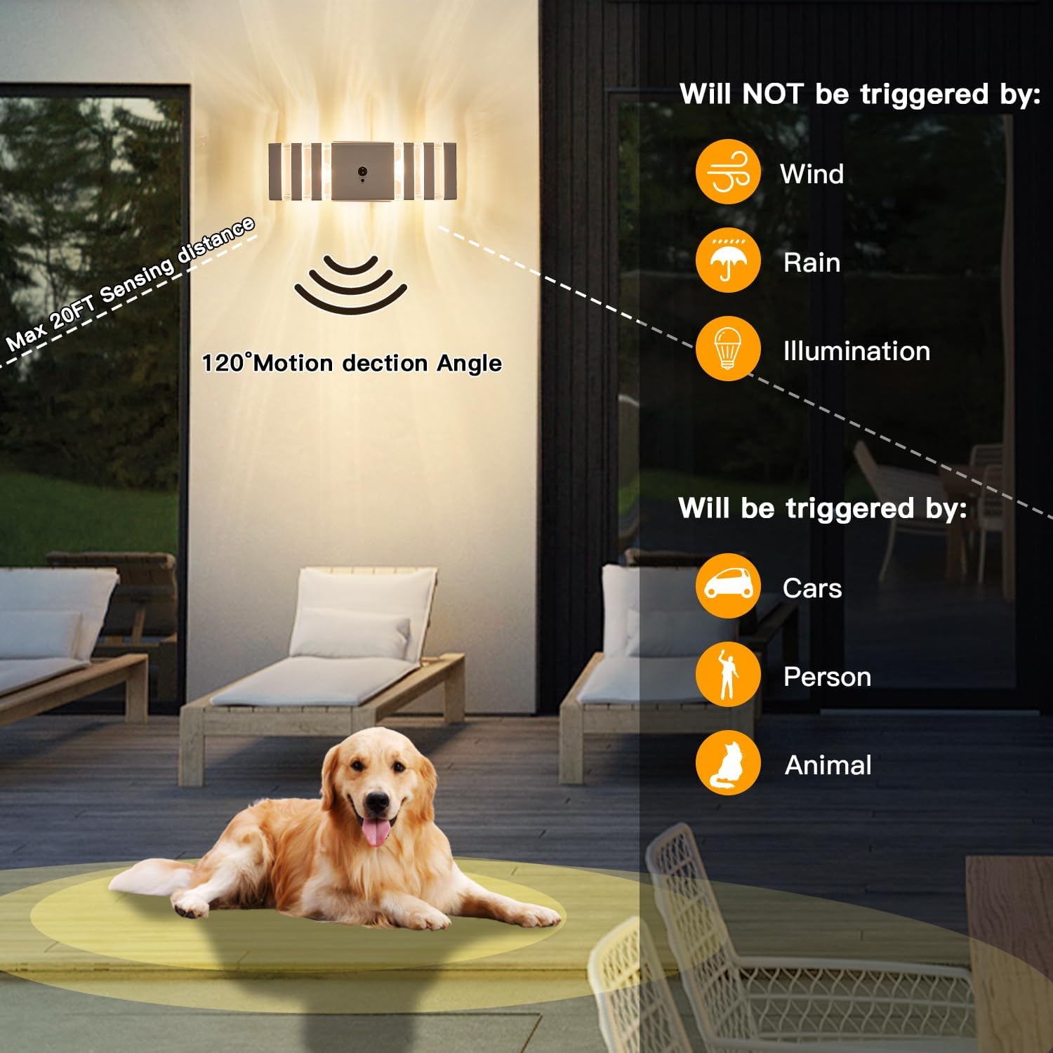 - ❗❗❗【Upgraded Motion Sensor】These motion sensor outdoor lights combining the advanced PIR motion sensor & IC light sensor. Featuring with dusk to dawn function, these motion sensor lights will auto turn on at dusk and off at dawn. Furthermore, with upgraded motion sensor, the outdoor motion sensor lights will auto light up your space with full brightness when motion detected at night.