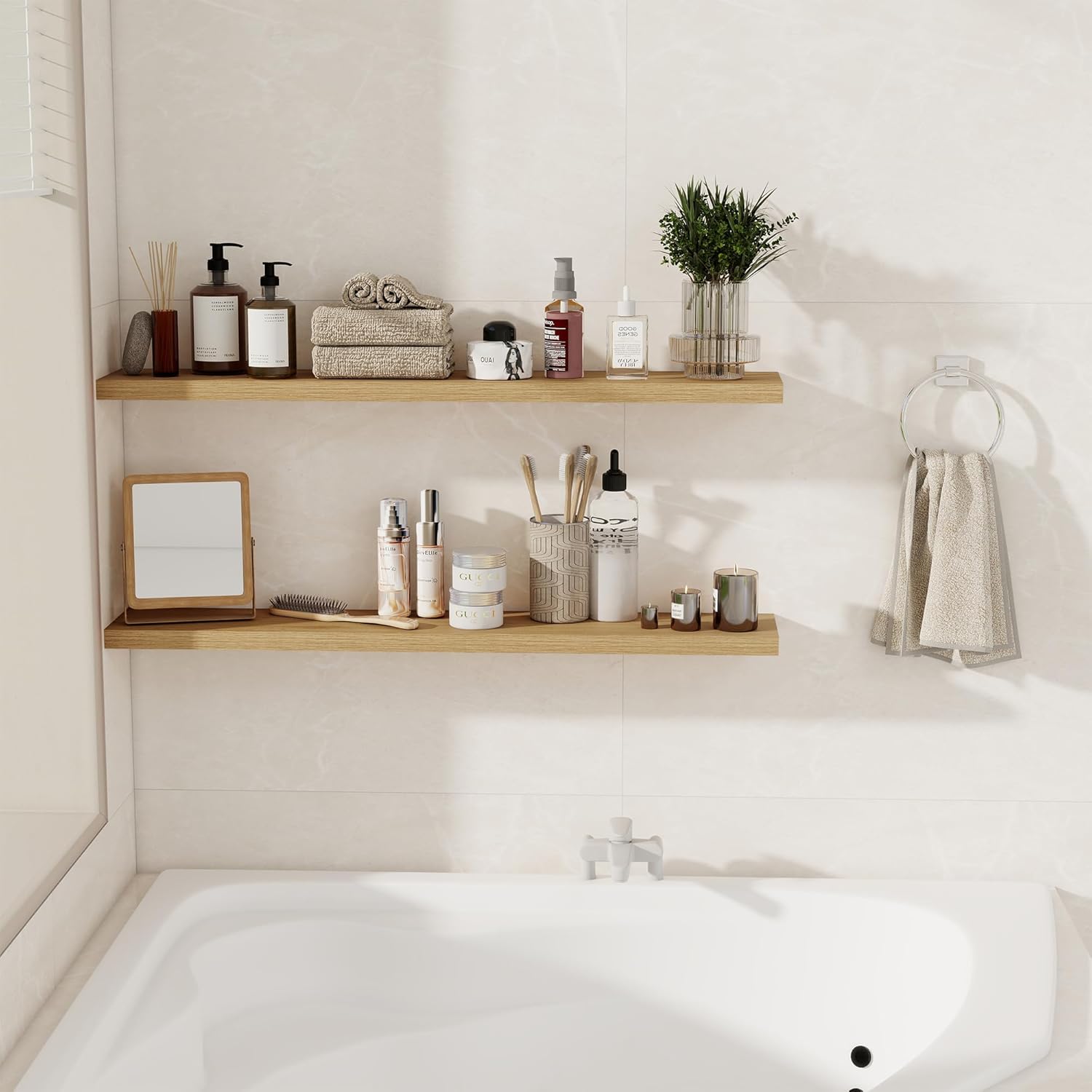 - STYLE & VERSATILITY: Elevate your home with our set of 2 elegant wall shelves, designed for versatile display options. Arrange them side by side for a clean, unified look, or stagger them for a bold, dynamic effect. Adding a touch of sophistication while providing practical storage