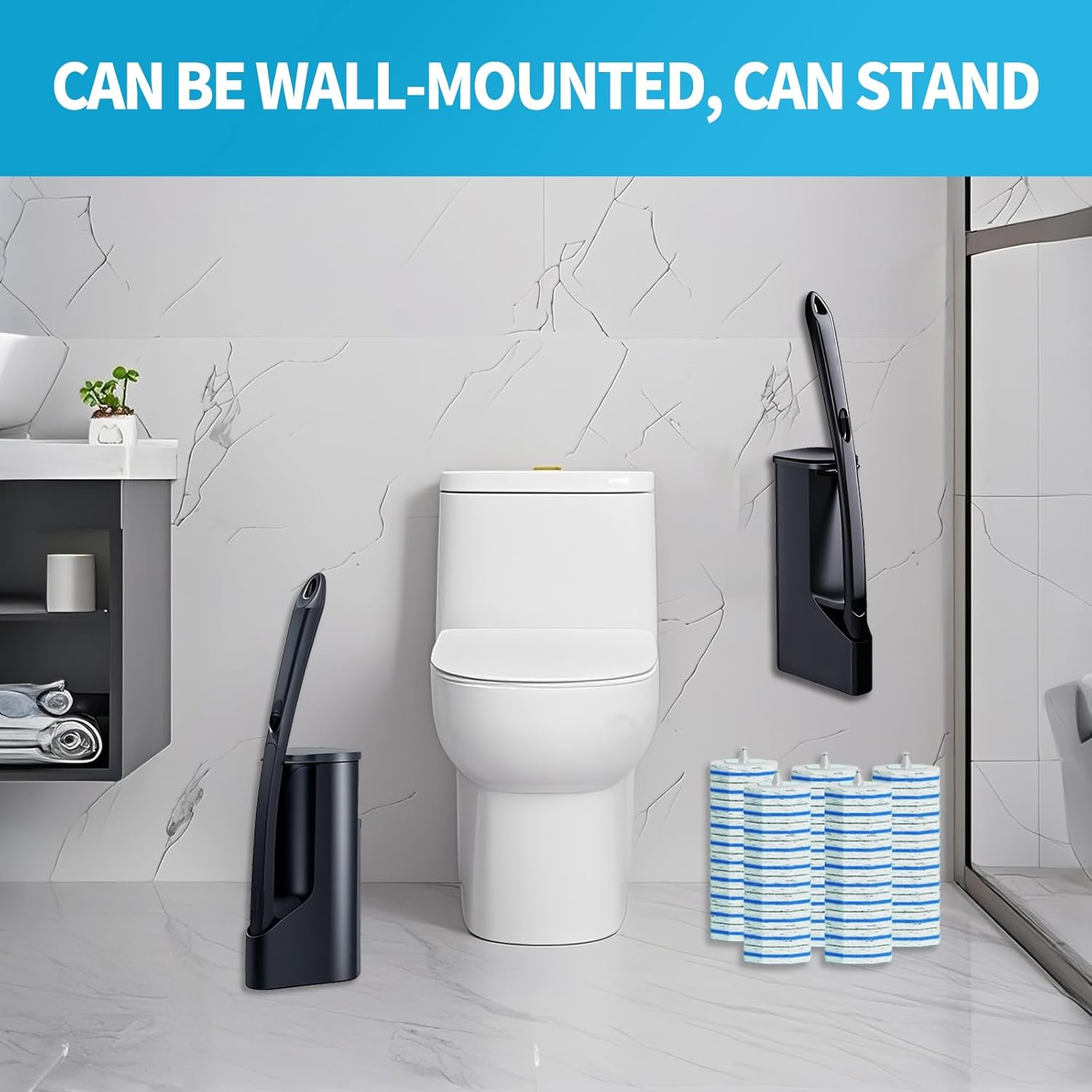 - black Toilet Cleaning Set:This toilet cleaning set includes 1 toilet stick, 1 storage box, and 50 disposable toilet stick replacement sets