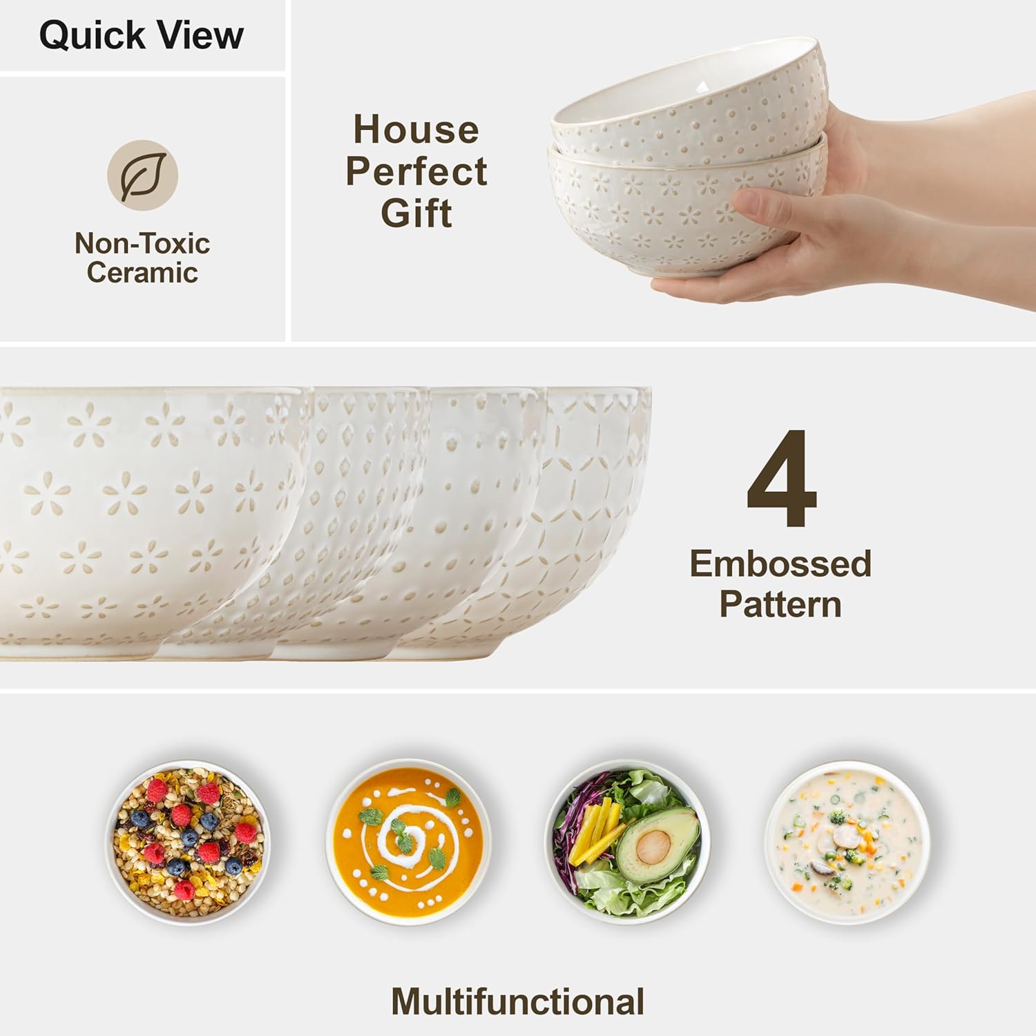 - 【Unique Embossed Pattern Designs】Each set of cereal bowls comes with 4 unique embossed patterns, these embossed designs are not only beautiful, but also increase the friction between your hand and the bowl, which can play a non-slip role. This set of bowls is also designed by our professional designers, perfect ergonomic design