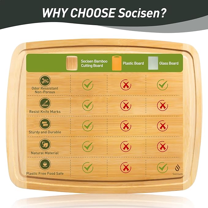 - Knife-Safe Surface for Edge Preservation: Our bamboo cutting board features a durable and thick surface. Meticulously polished to be ultra-smooth and flat, it has no burrs, cracks, or splinters. The bamboo cutting board is gentle on knives, reducing dulling and blade damage. Whether using a serrated knife for bread or a chef's knife for vegetables, the wood cutting board prevents blades from dulling quickly, saving you time on sharpening and allowing more time for enjoying your cooking.