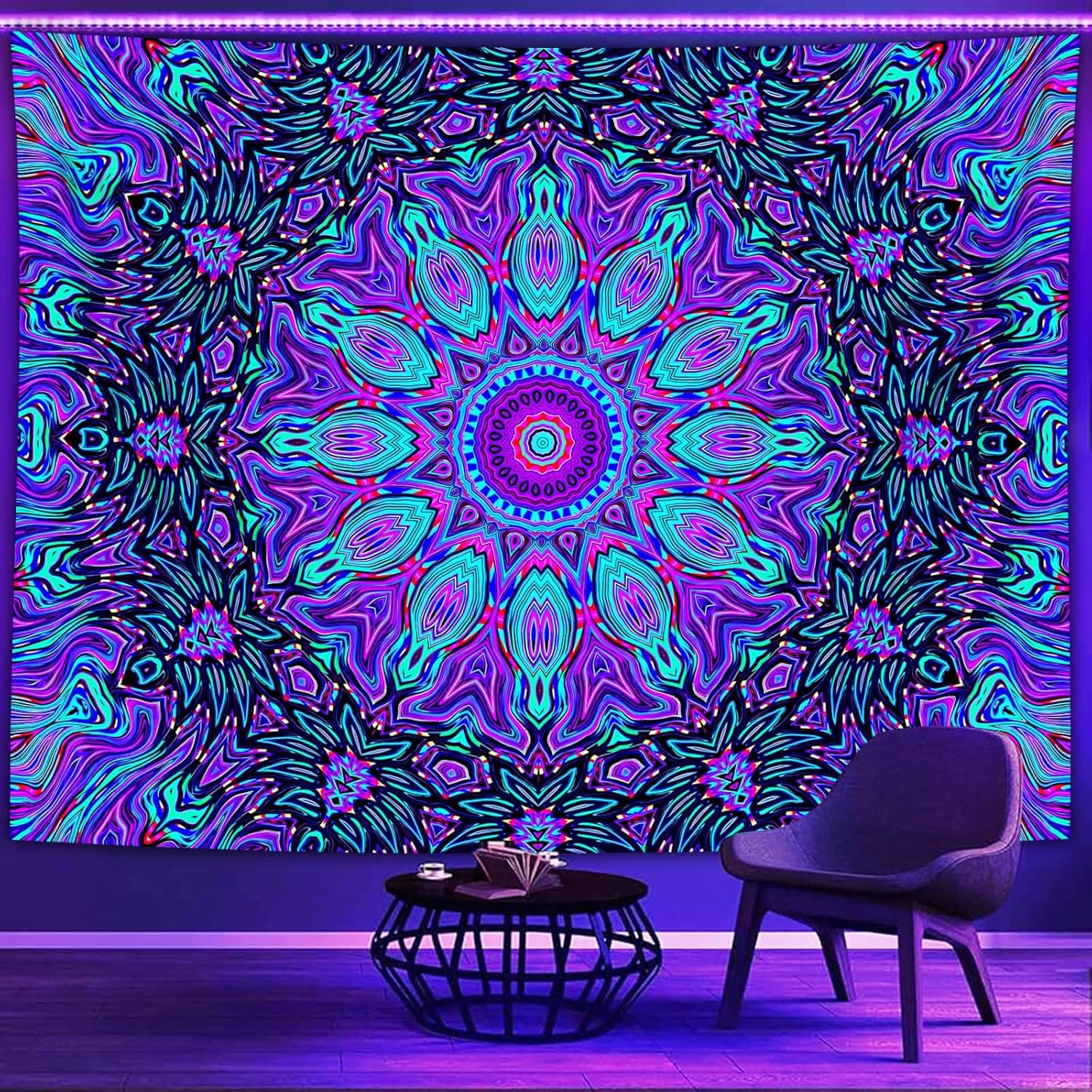 PSYHILAR Blacklight Mandala Tapestry for Bedroom, Psychedelic Black Light Posters for Adults and Teens, Neon UV Reactive Aesthetic Bohemian Art Wall Hanging Decor (90 x 70 Inches)