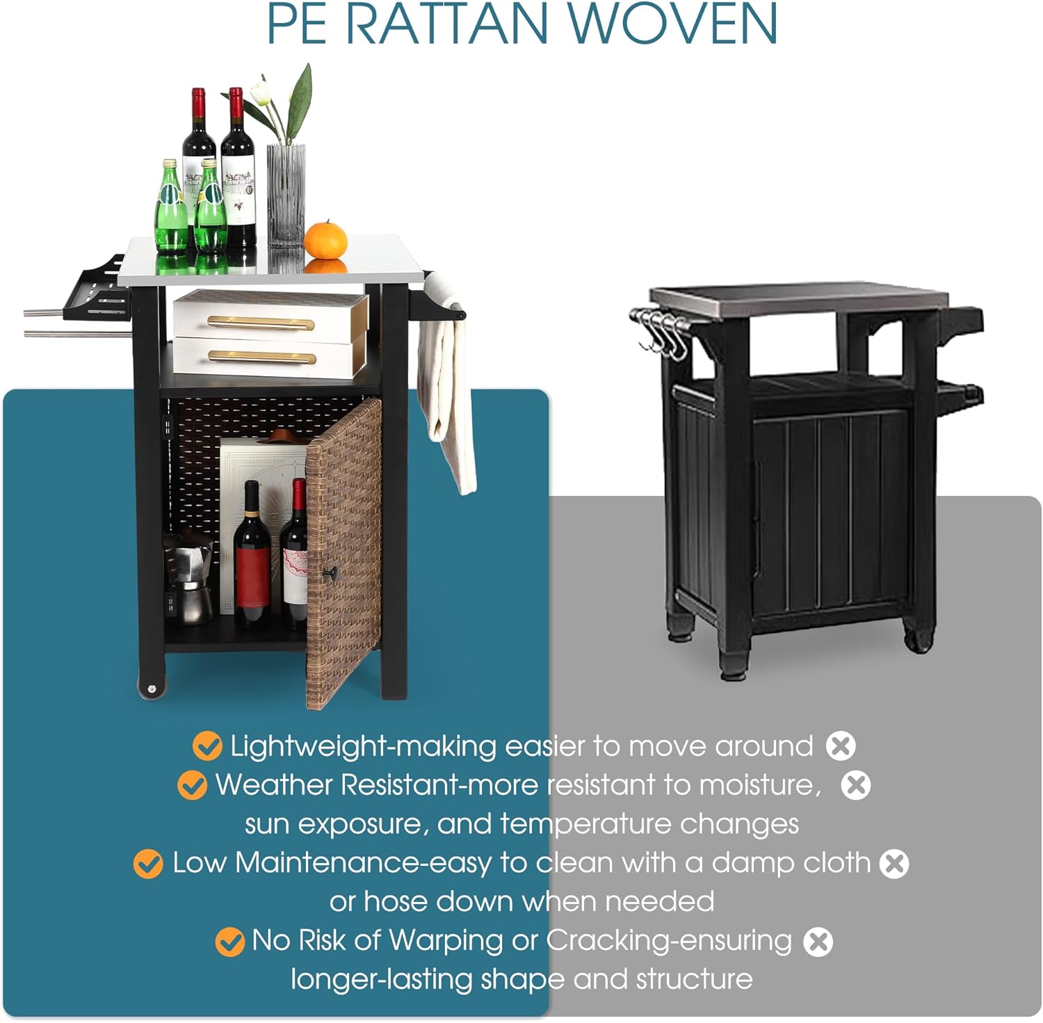 - VERSATILE FUNCTIONALITY: The stainless steel top of the wicker bar cart doubles as a prep station, making it highly functional for various use. Use it to organize your bar tools, set up a grilling station, or serve appetizers at your next outdoor party