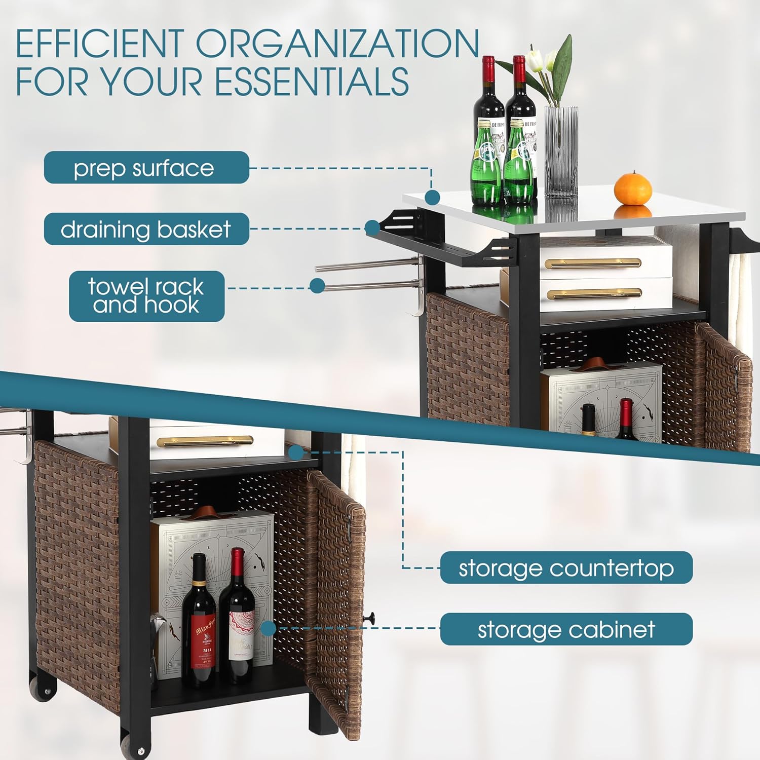 - ORGANIZATION FOR YOUR ESSENTIALS: With this outdoor bar catr dedicated spaces like a towel rack, draining basket, prep surface, storage countertop, and a storage cabinet, ensures that your bar tools and serving essentials are always within easy reach
