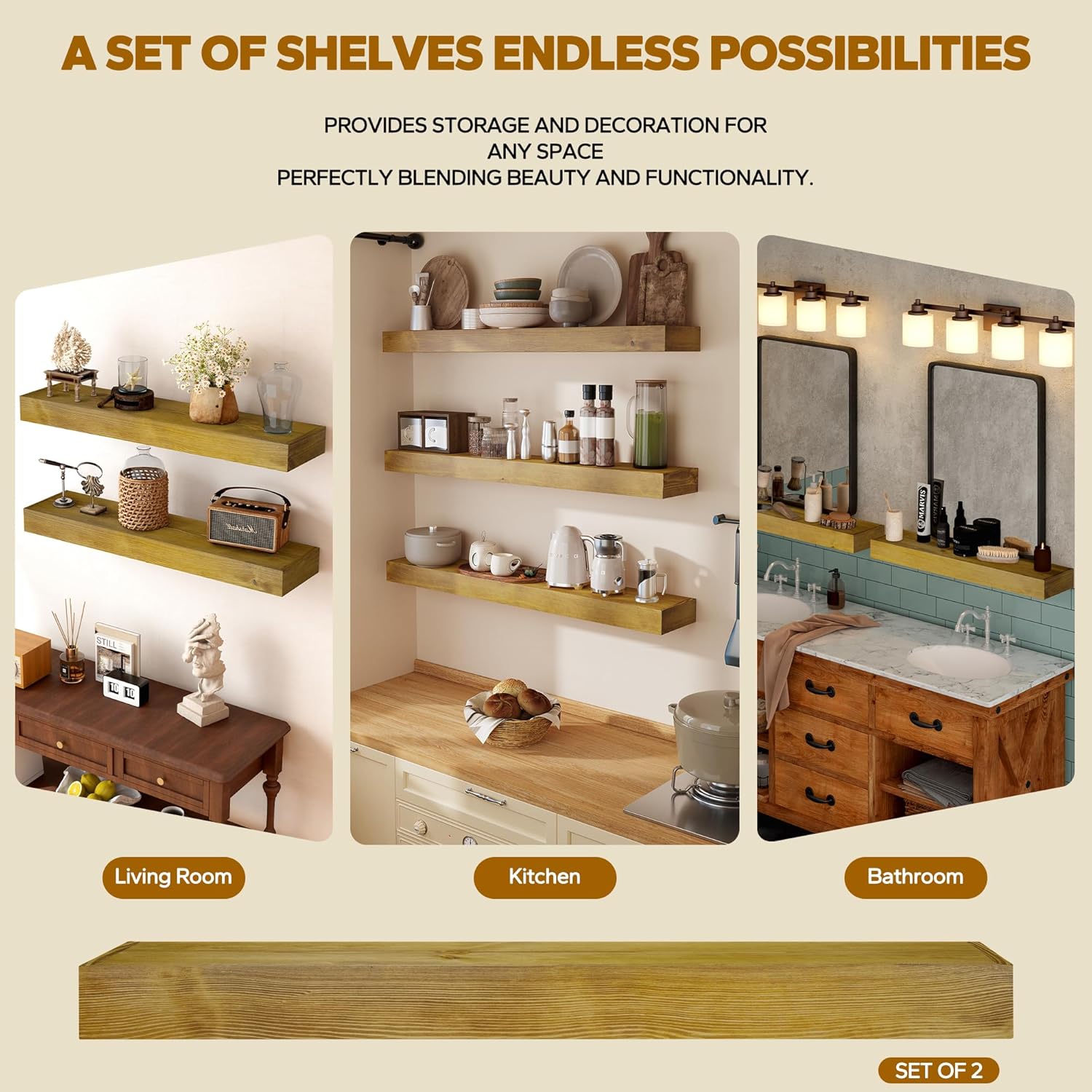 - Stylish and Versatile Storage Solution: Upgrade your living spaces with these 3'' thick rustic wood shelves, perfect for kitchens, bedrooms, bathrooms, living rooms, or offices. They combine rustic charm with modern functionality, serving as both decorative and practical storage.