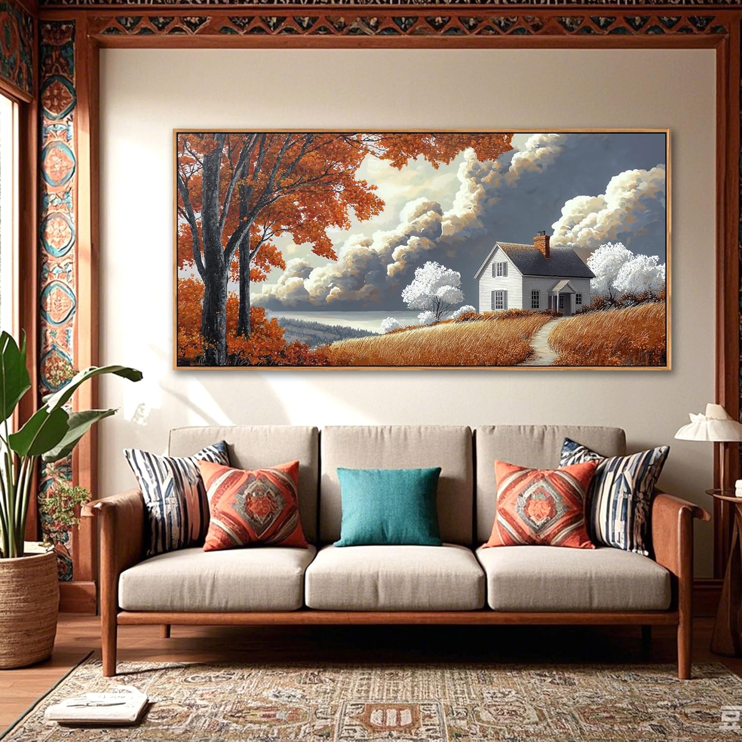 - Enchanting Autumn Aesthetic: Transform your wall art for living room with this fall wall art masterpiece. Fiery orange leaves contrast white cottage trees under dramatic skies, evoking nostalgic autumn warmth. A large wall art statement piece doubling as wall art bedroom charm for seasonal ambiance.