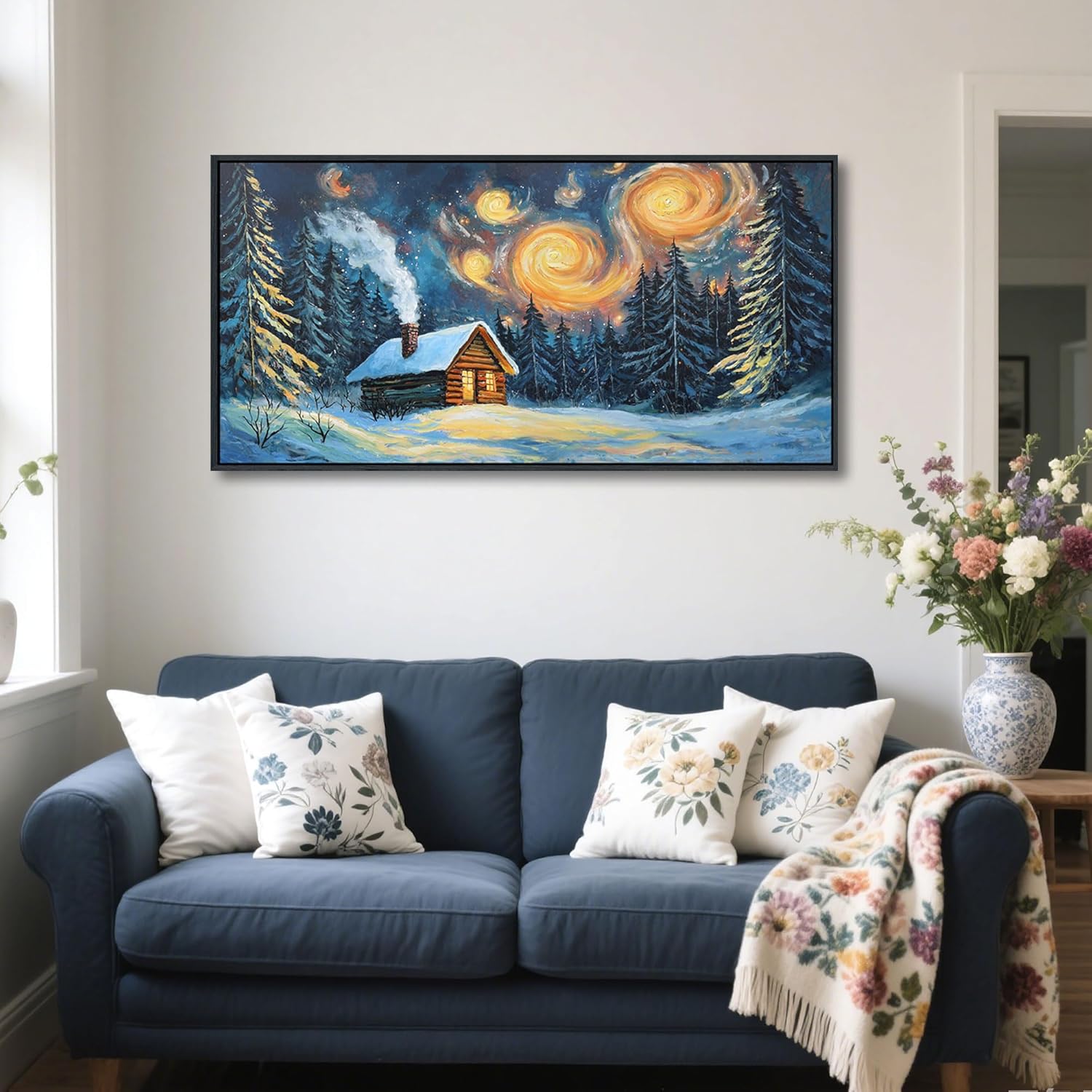 - Large Wall Art for Living Room : This framed canvas wall art presents a magical blend of a winter wonderland and a mesmerizing starry sky. The snow-capped cabin amidst tall pine trees, with smoke curling from the chimney, exudes warmth.Its fusion of landscape wall art and abstract elements makes it versatile for modern, rustic, or bedroom wall decor.