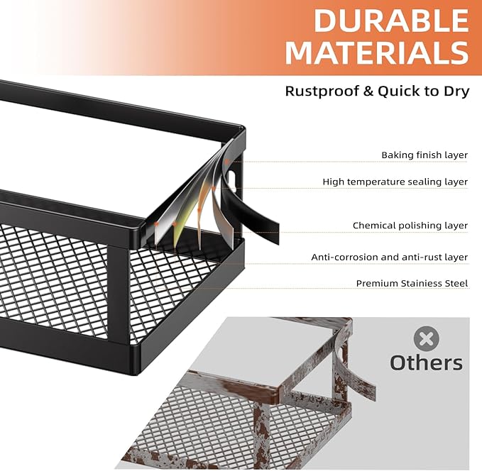 - Premium Metal Material and Stable Storage: The spice rack wall mounted is made of thickened high-strength carbon steel,is waterproof, rustproof, easy to clean.Our spice rack comes with additional 2.76-inch side guards and reinforced adhesive stickers to ensure safety and stability.