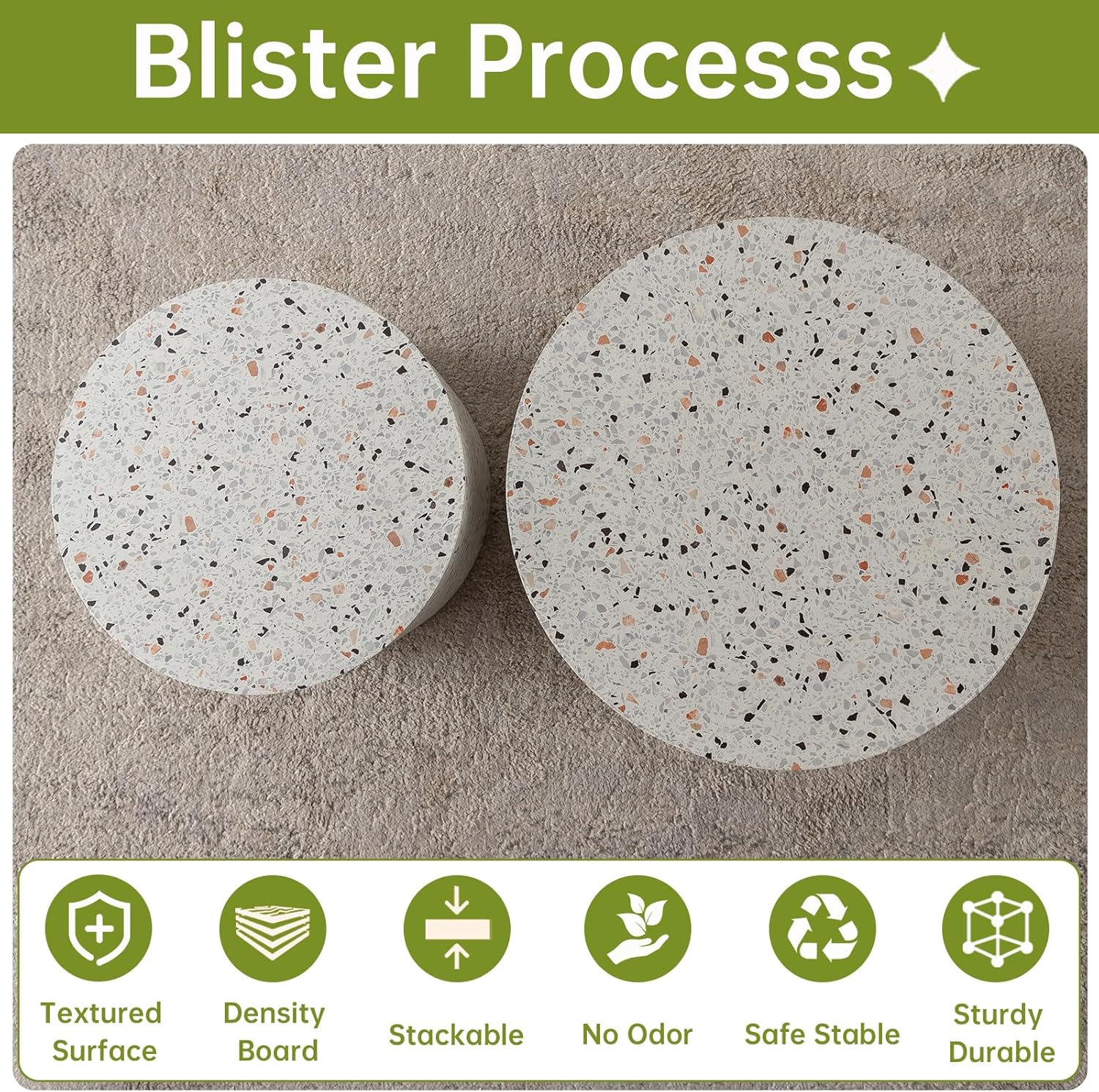 - [Timeless Aesthetic, Effortless Elegance] Designed with a sleek round silhouette and a chic beige textured finish, this nesting table set complements modern, industrial, farmhouse, and luxury interiors alike. Round coffee table set of 2 a statement piece that always feels right at home!