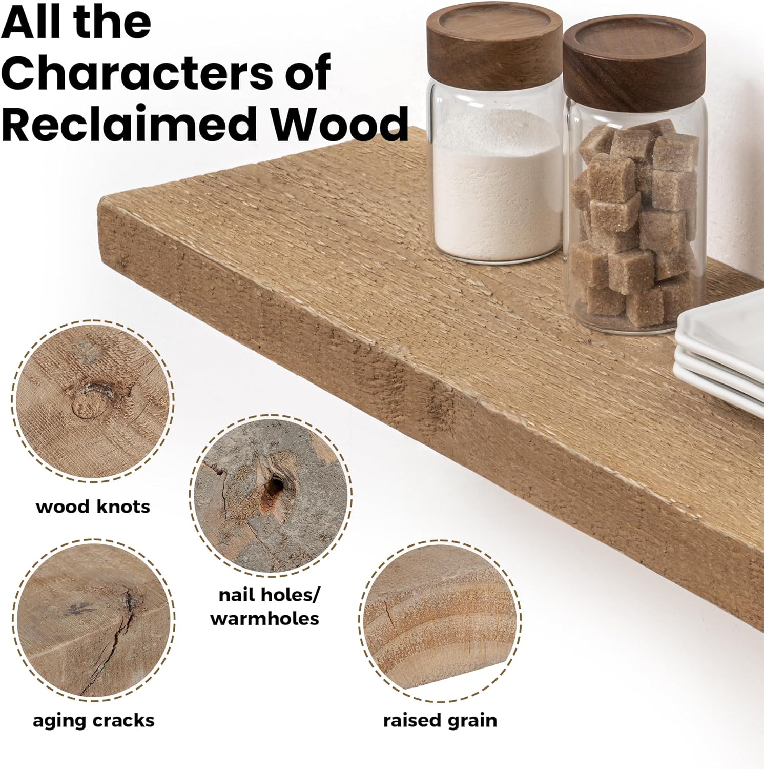 - Authentic Reclaimed Wood -- Our hanging shelves are beautifully crafted from solid reclaimed barnwood with natural markings(nail holes, screw holes, discoloration, scratches, dents, and many other variations), making each piece a unique work of art. These marks reveal the wood's rich history and bring character to your home decor. We do not alter these natural variations, but ensure safety by removing any excess nails and burrs. No two pieces are alike