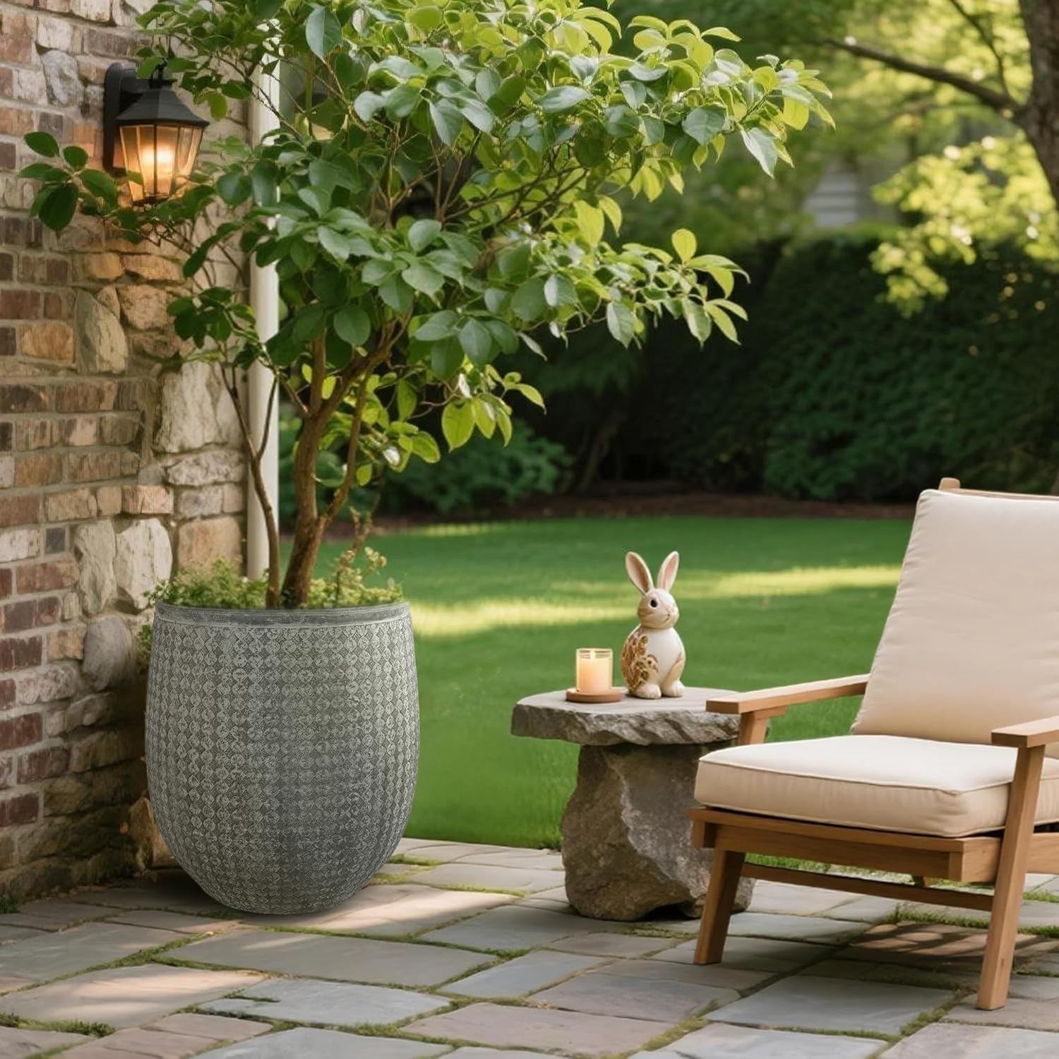Worth Garden 12" Dia x 15" H Grey Round Planter – Lightweight Magnesium Oxide Cement Plant Pot with Texture – Raised Pattern Concrete Look – Drainage Hole – Indoor & Outdoor Use