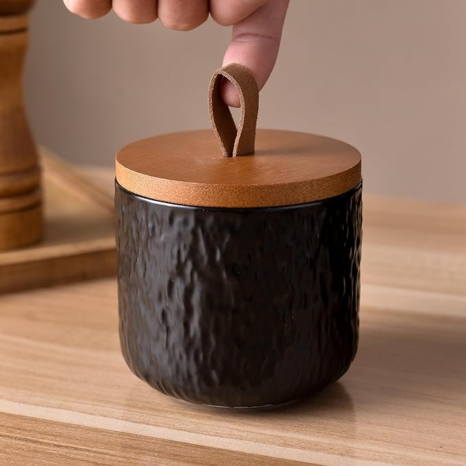 - Bold & Modern Black Stone Texture - Featuring a unique black stone-like texture, these canisters offer a sleek, modern aesthetic that will enhance any kitchen or space. The natural bamboo lids complement the design, adding a touch of warmth to the overall look.
