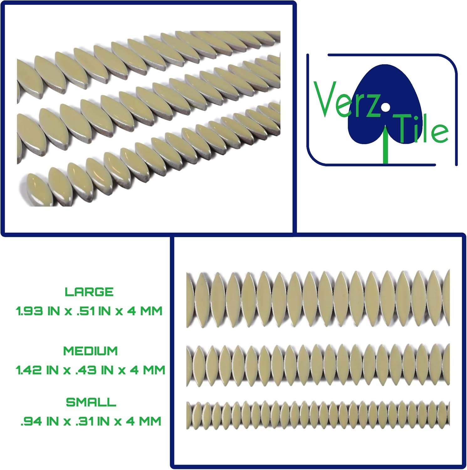 - High Fired Equals Durability; Ceramic Mosaic Tiles are Water Resistant with a Shiney Glazed Finish; Mosaic Pieces in 3 Sizes; Small Tiles(.94in x .31in or 2.4cm x 0.8cm) Medium (1.42in x .43in or 3.6cm x 1.1cm) Large (1.93in x .51in or 4.9cm x 1.3cm); Thickness 4mm