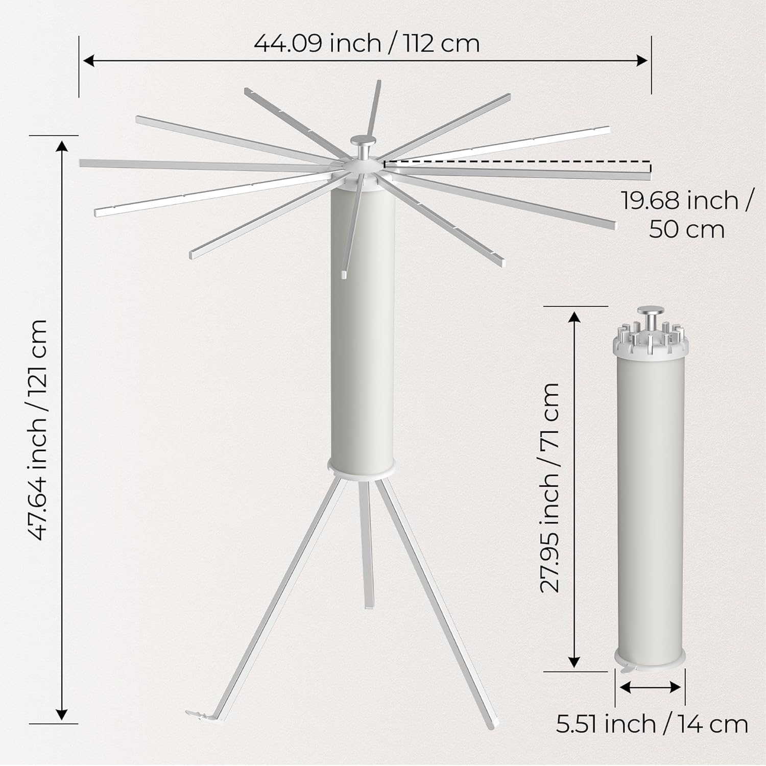 - 【Sturdy and Durable】The clothes drying rack has 12 rods and a strong tripod structure that can support up to 35 pounds of clothing; Depending on your needs for space and usage needs, you can increase the number of arms you require.The folding drying rack's unique tripod design allows it to remain perfectly stable in a limited area.