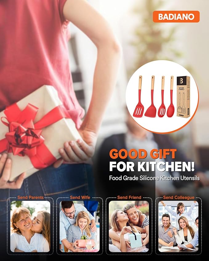 Silicone Cooking Utensils Set, Perfectly Angled for Frying, Mixing,Serving,Draining,Turning and Stirring, BPA-Free Matte Silicone, Wood Handles, Safe for Nonstick Cooking Surfaces,4 Pack (Red)