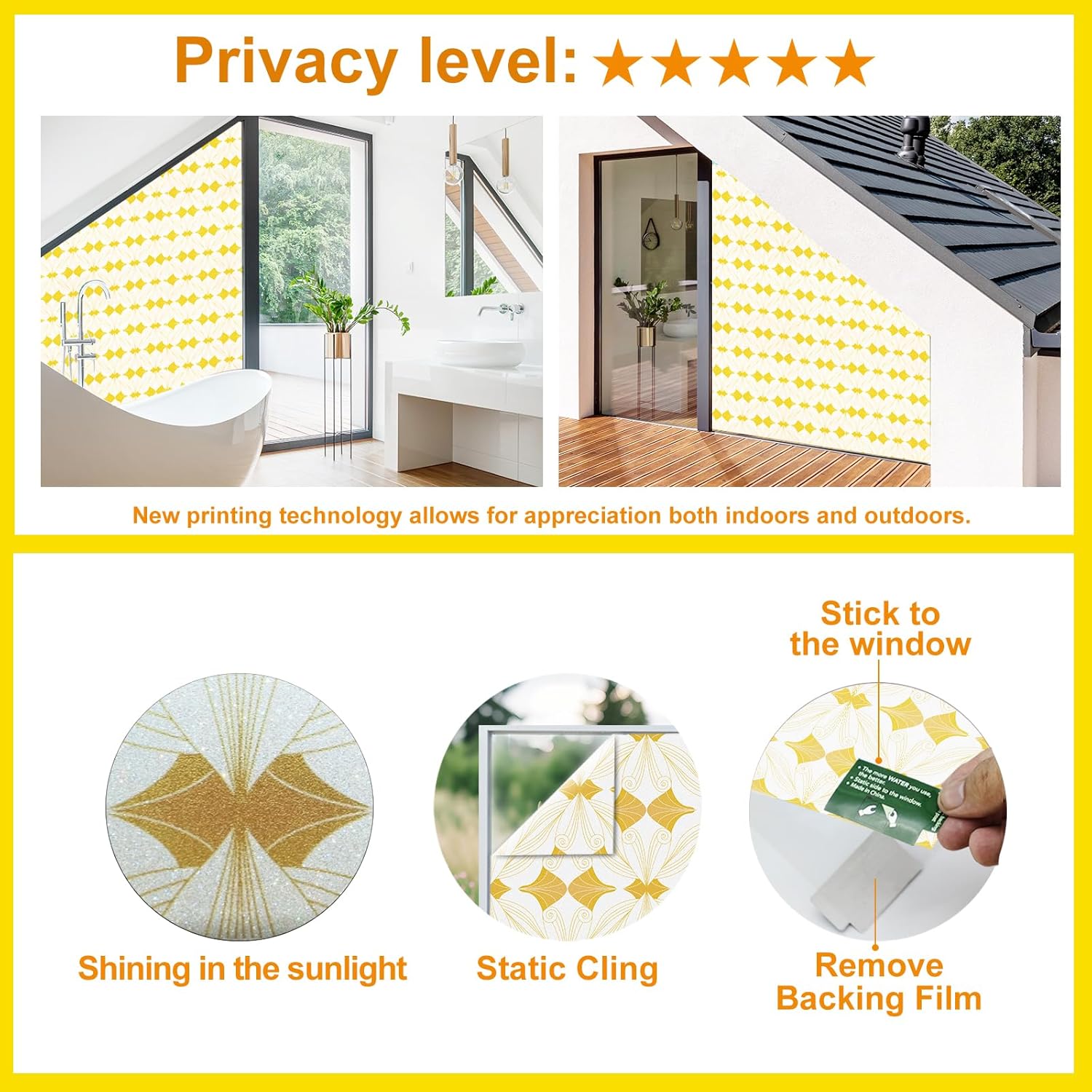 Window Privacy Film Stained Glass Decorative Static Clings Frosted Window Tint for Home Room Decor Bathroom Door Car Stickers with Glittering Effect, Removable(Golden Geometry)
