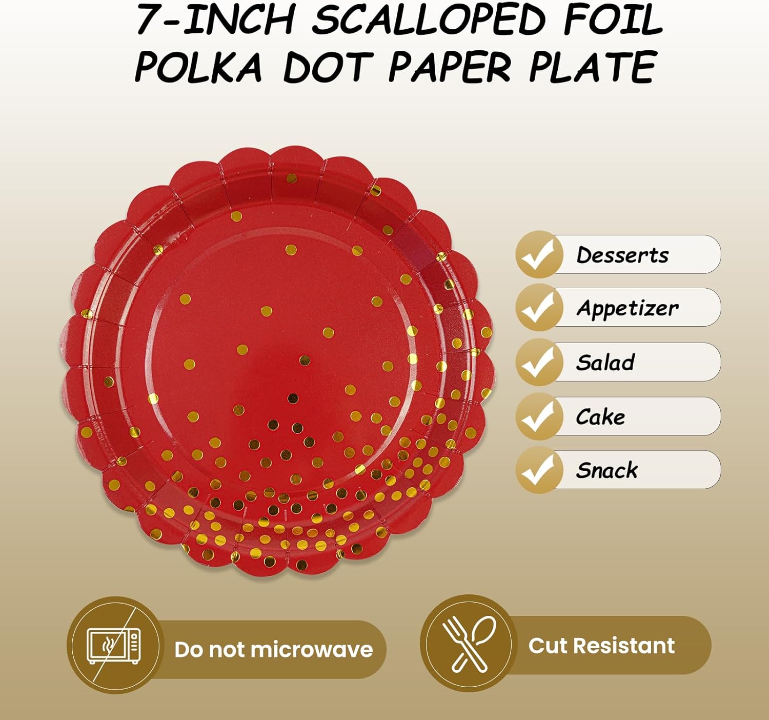 50PCS Red Paper Plates, 7 Inch Scalloped Red and Gold Party Plates Disposable Foil Polka Dots Dessert Plate Cake Plate for Wedding Baby Shower Birthday Anniversary Bachelorette Dinner BBQ