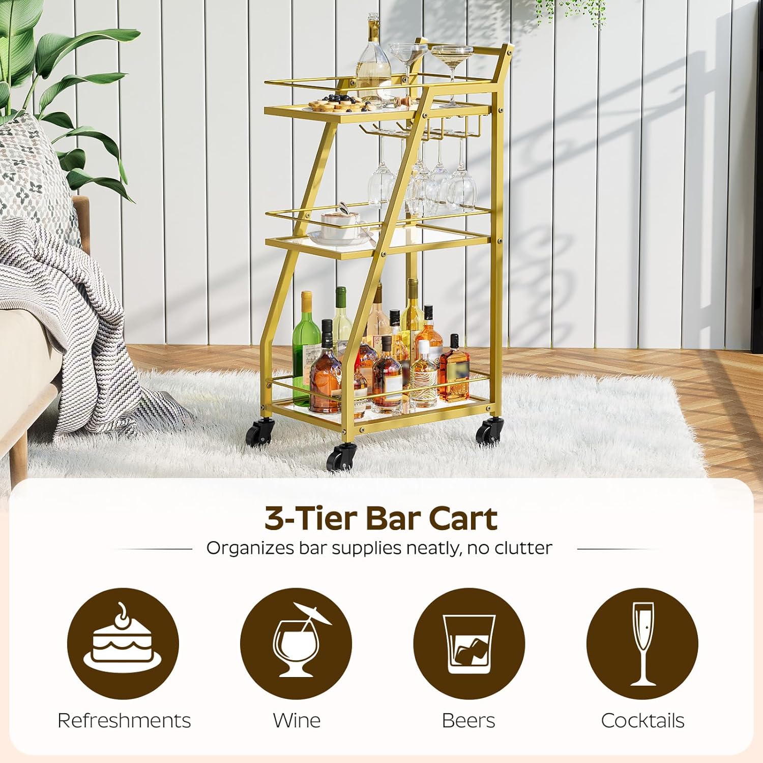 - Cup Holders Included: This bar cart has 2 quality metal cup holders for storing 6 goblets, ensuring stability while the cart is in motion. Whether you're preparing drinks or moving the cart during a gathering, you can use it with confidence