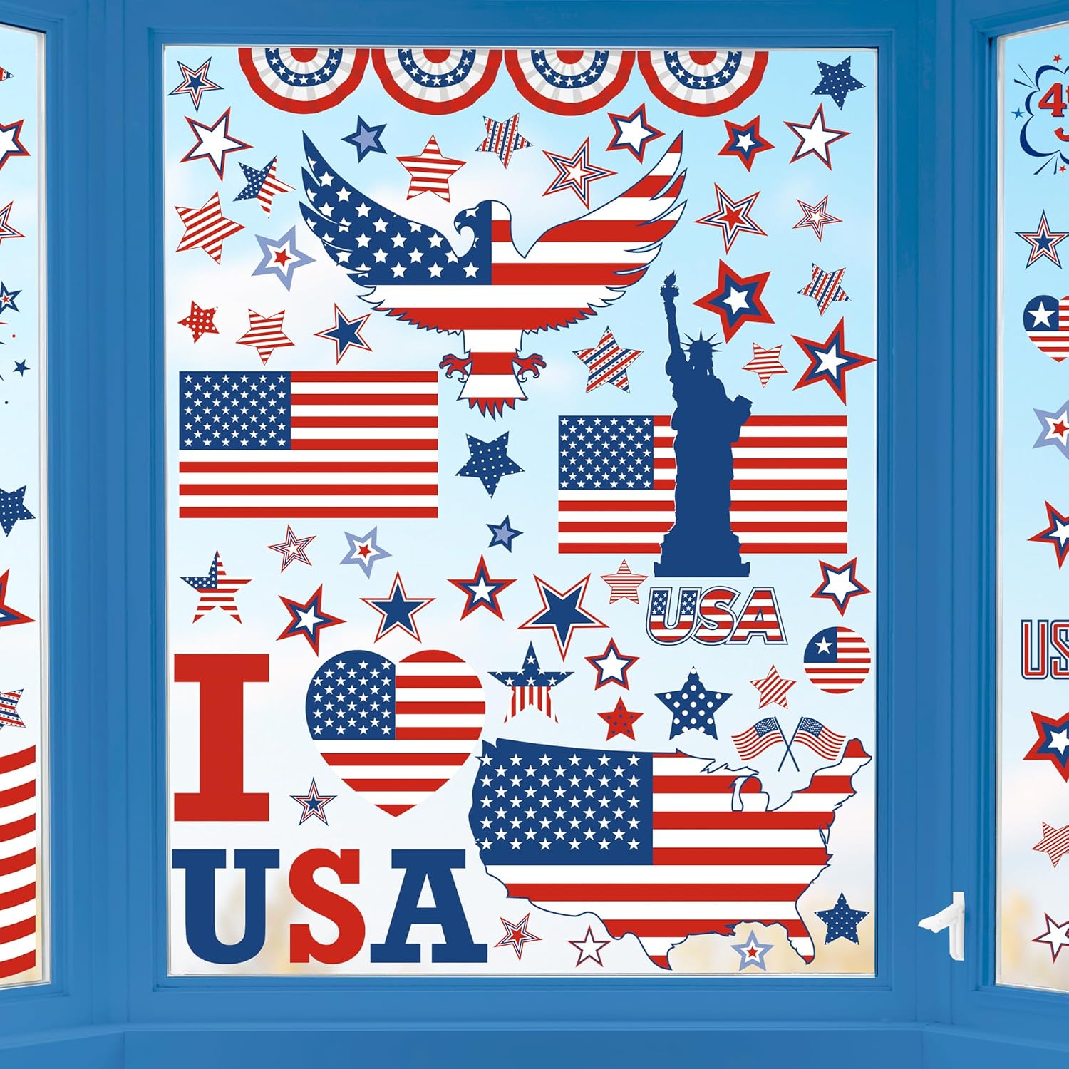 - Patriotic Window Cling Set - Get 158 reusable 4th of July window clings for glass windows, each measuring 7.87"x11.81". Made from waterproof PVC material, these patriotic decorations resist fading for indoor/outdoor use and serve as anti-collision window stickers for birds.