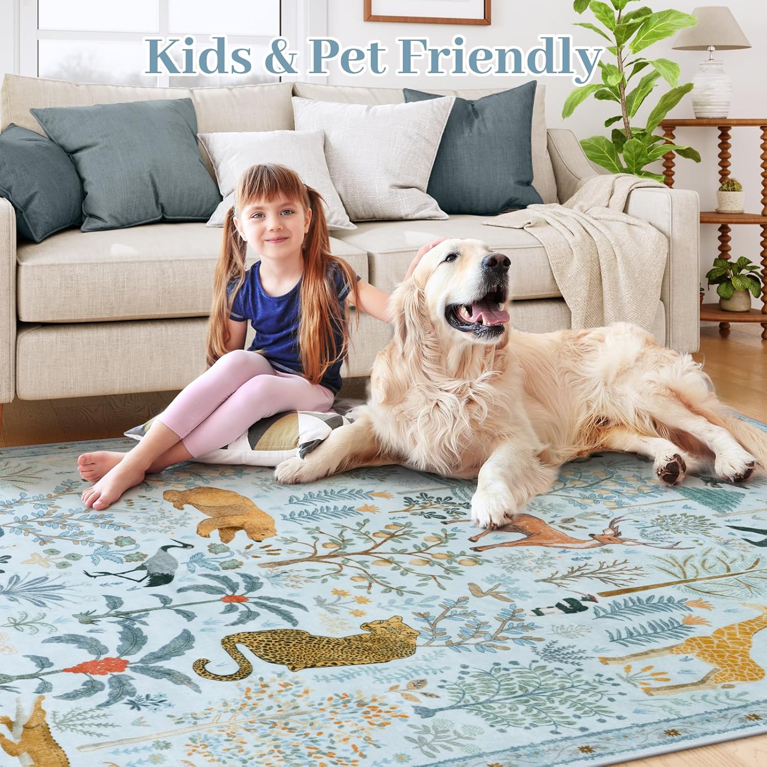 - Unique & Functional: This area rug features a delightful assortment of animals - tigers, pandas, giraffes, elephants, and more - surrounded by tropical flora. The best choice for your living room, kitchen, entryway, bedroom, home office, dining room, kids' playroom, nursery, dorm, kids' room or more