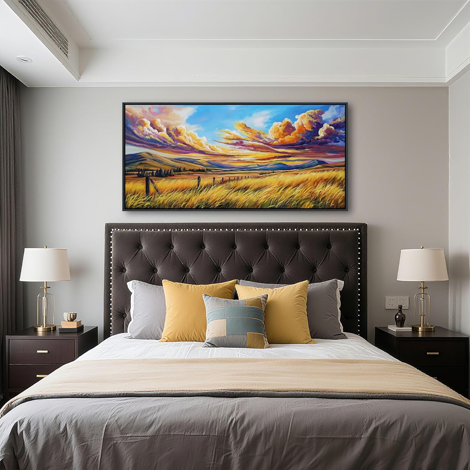 - Paintings Wall Decor Artwork: The expansive view of the fields and the glorious sky in this painting has a positive, uplifting effect on the mood. This large wall art can serve as a daily reminder of the beauty of the natural world, helping you relax and unwind after a long day, and creating a pleasant and inspiring atmosphere in your space.