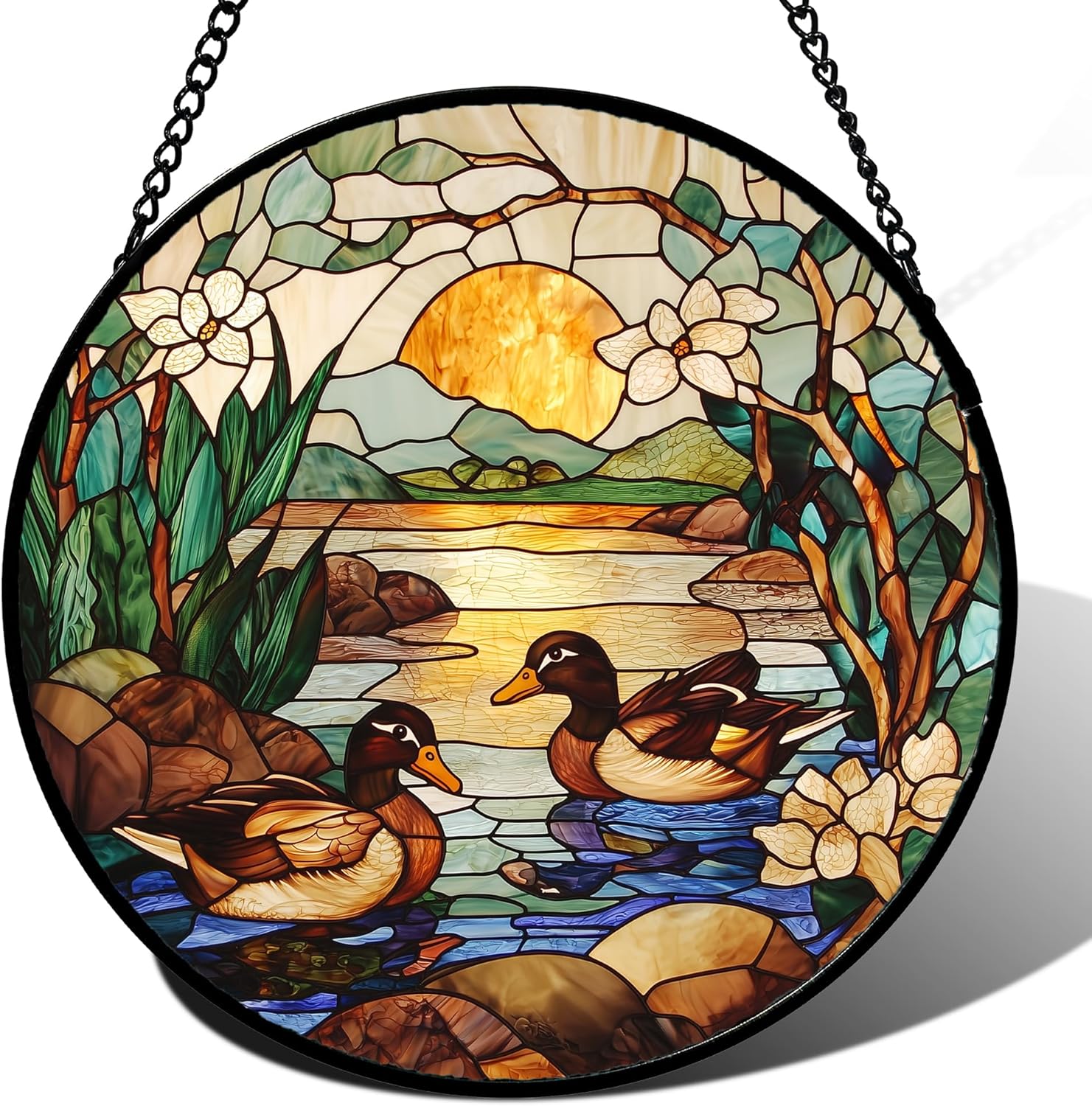 Stained Glass Window Hanging, Ducks in The Pond Sun Catcher for Door Home Decor Landscape Plant Suncatcher Christmas Mother's Day Birthday Gifts for Women Men Mom Nana 6.3 in