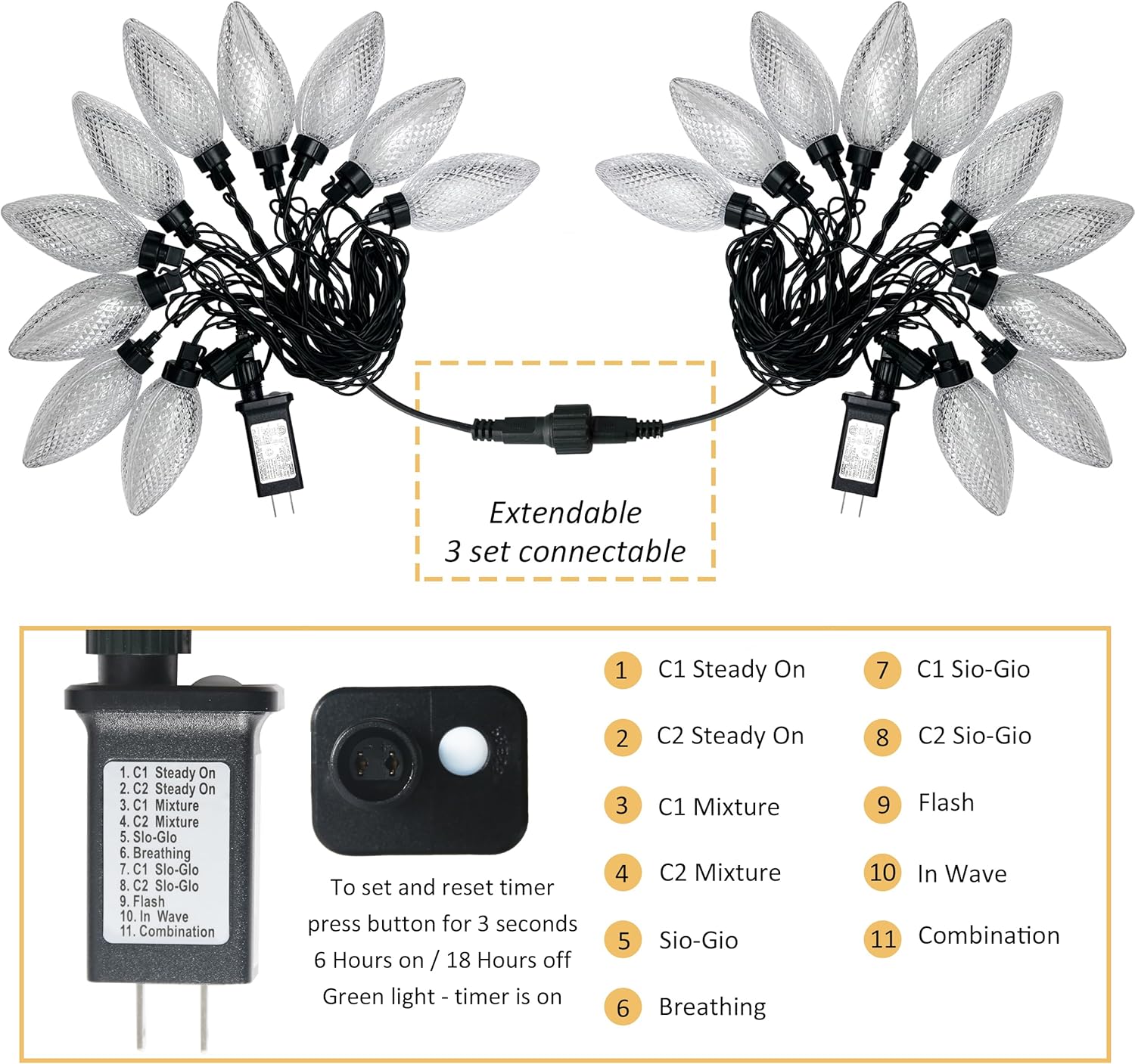 - 【High Quality & Extendable】These classic 3D pinecone shapes Lights are crafted from plastic, making them both shatter-resistant & long-last, powered by an adapter.. The lights are spaced 19.6 inches apart, with a power cord measuring 9.84 feet and a light string length of 14.76 feet, adding up to a total length of about 24.6 feet. These LED string lights have safe plugs for both ends and can connect up to 3 sets, reaching a maximum length of 73.8 feet.