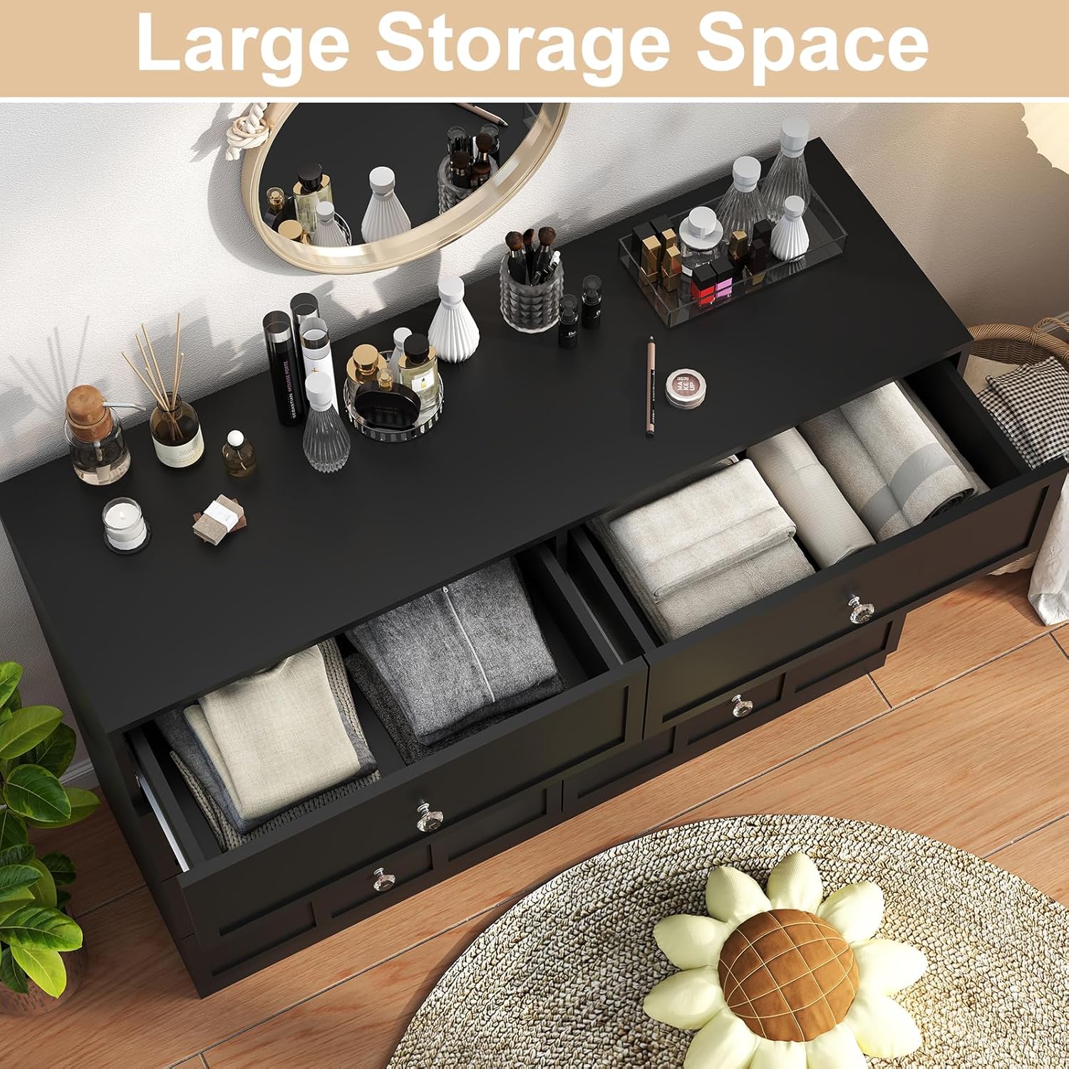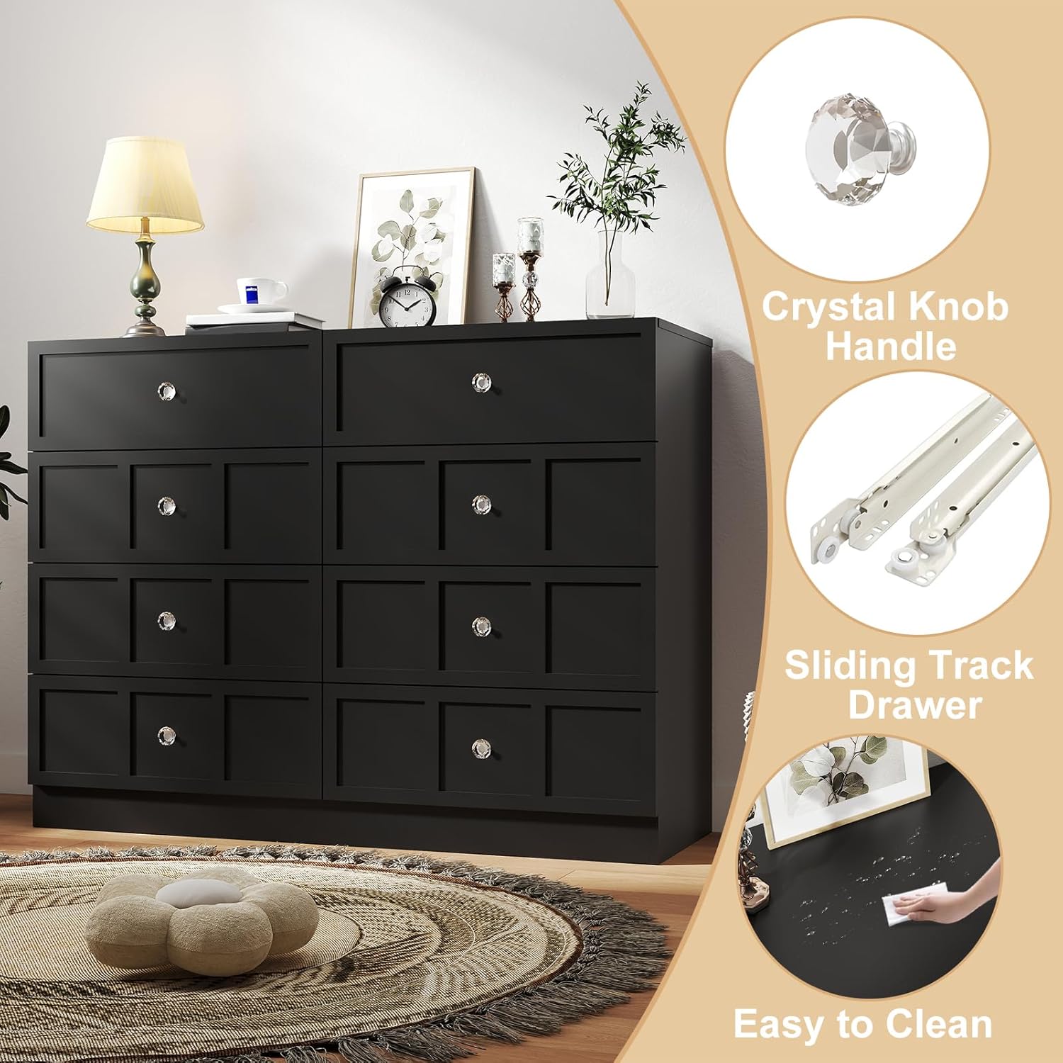 - Premium Materials Crafted for lasting quality, our 8 drawer black dresser for bedroom features high-grade engineered wood with a specially treated surface that's scratch-resistant and easy to clean. A simple wipe restores its pristine finish. The fluted 8 drawer dresser showcases crystal knobs that combine elegant design with satisfying tactile feedback, making every use a pleasure.