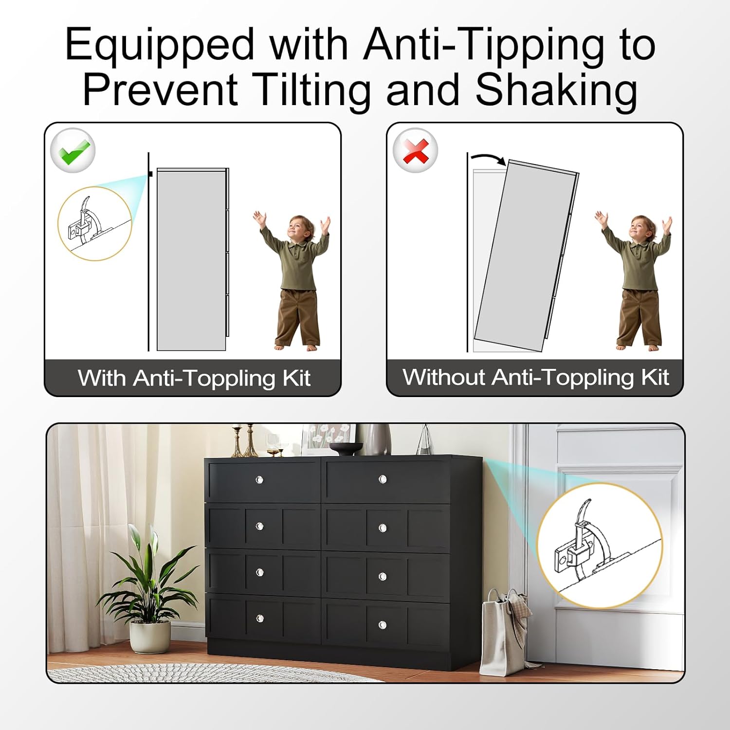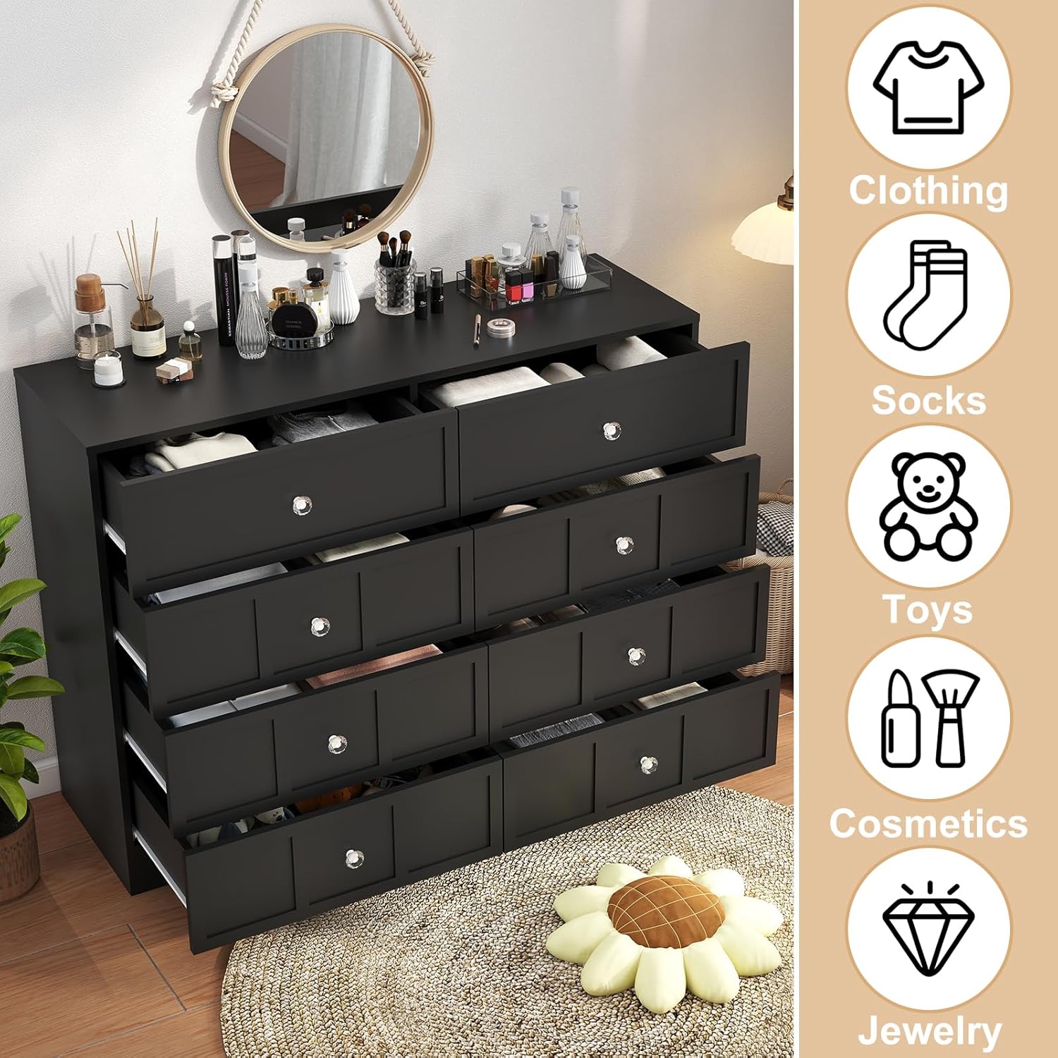 - Durable & Stable Construction Built to last, this black dresser 8 drawer for bedroom features premium ball-bearing drawer glides for smooth operation and exceptional weight capacity. Whether storing clothes, toys or office supplies, the black 8 drawer dresser wide maintains steadfast stability. The black 8 drawer dressers for bedroom retains its flawless performance and appearance even with daily use over time.