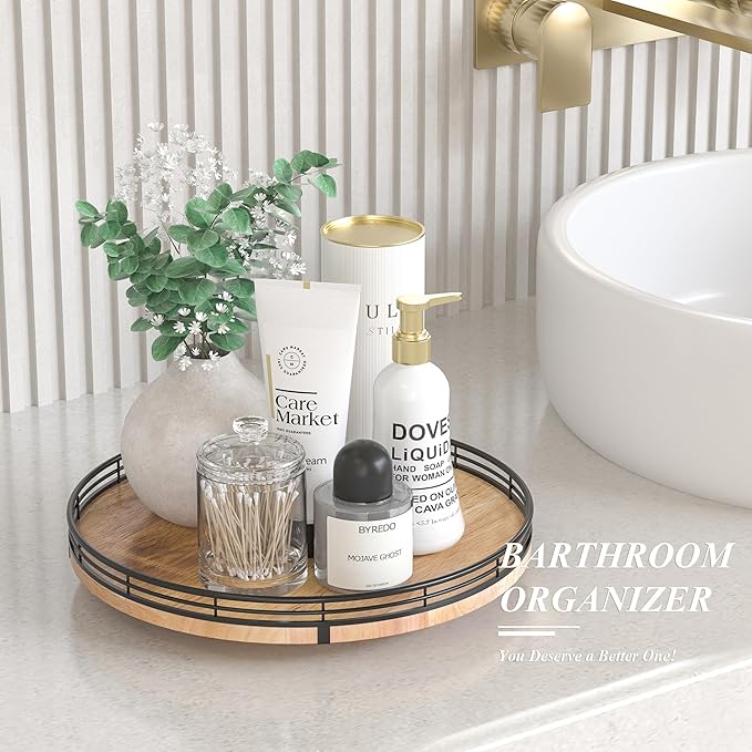 - PREMIUM MATERIAL: Our farmhouse lazy Susan organizer is made of natural solid oak wood and strong metal, sturdy, durable and premium quality. This wooden turntable organizer is a game-changer for keeping your kitchen organized. The farmhouse oak finish gives it a rustic, charming look that will fit perfectly with your kitchen decor.