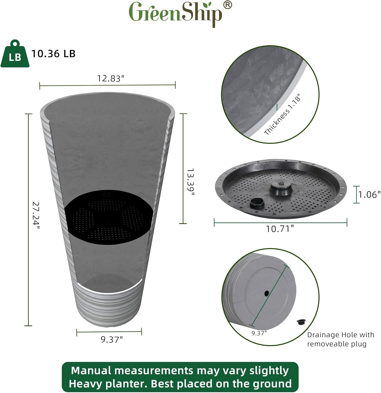 GreenShip 27" Tall Planters, Set of 2 – Black Outdoor Planter for Front Porch & Tall Plants, Weather-Resistant, with Drainage Hole & Rubber Plug (No Plants Included) (Light Gray)