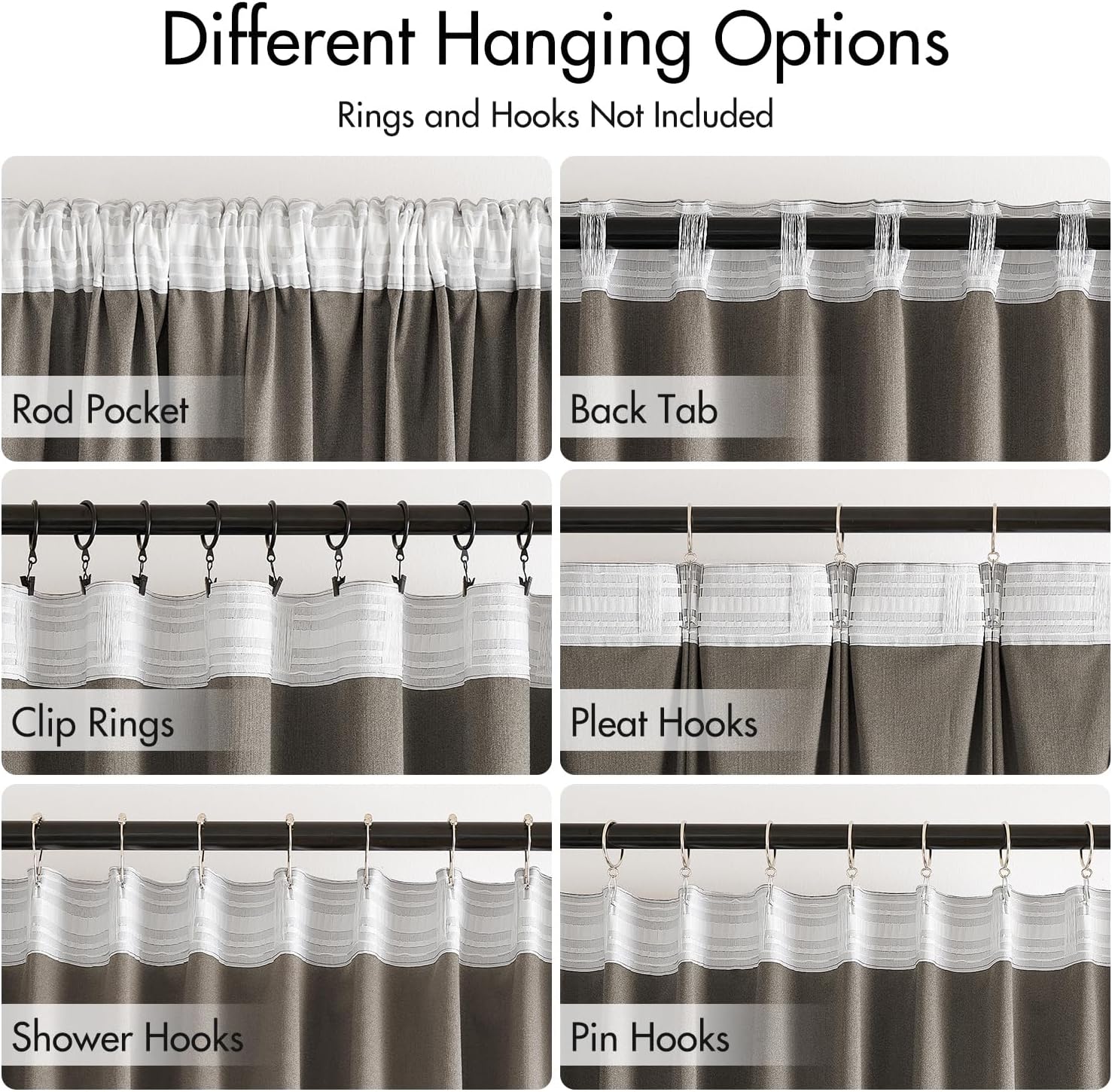 - HANGING OPTIONS: Each curtain panel has 3-in-1 top style design: rod pocket, back tab and pinch pleat. Back loop (2.3 inch) and rod pocket (3.1 inch) fit most standard rod. Curtains also can be hung with clip rings or curtain hooks. 3 ways to meet your various needs.