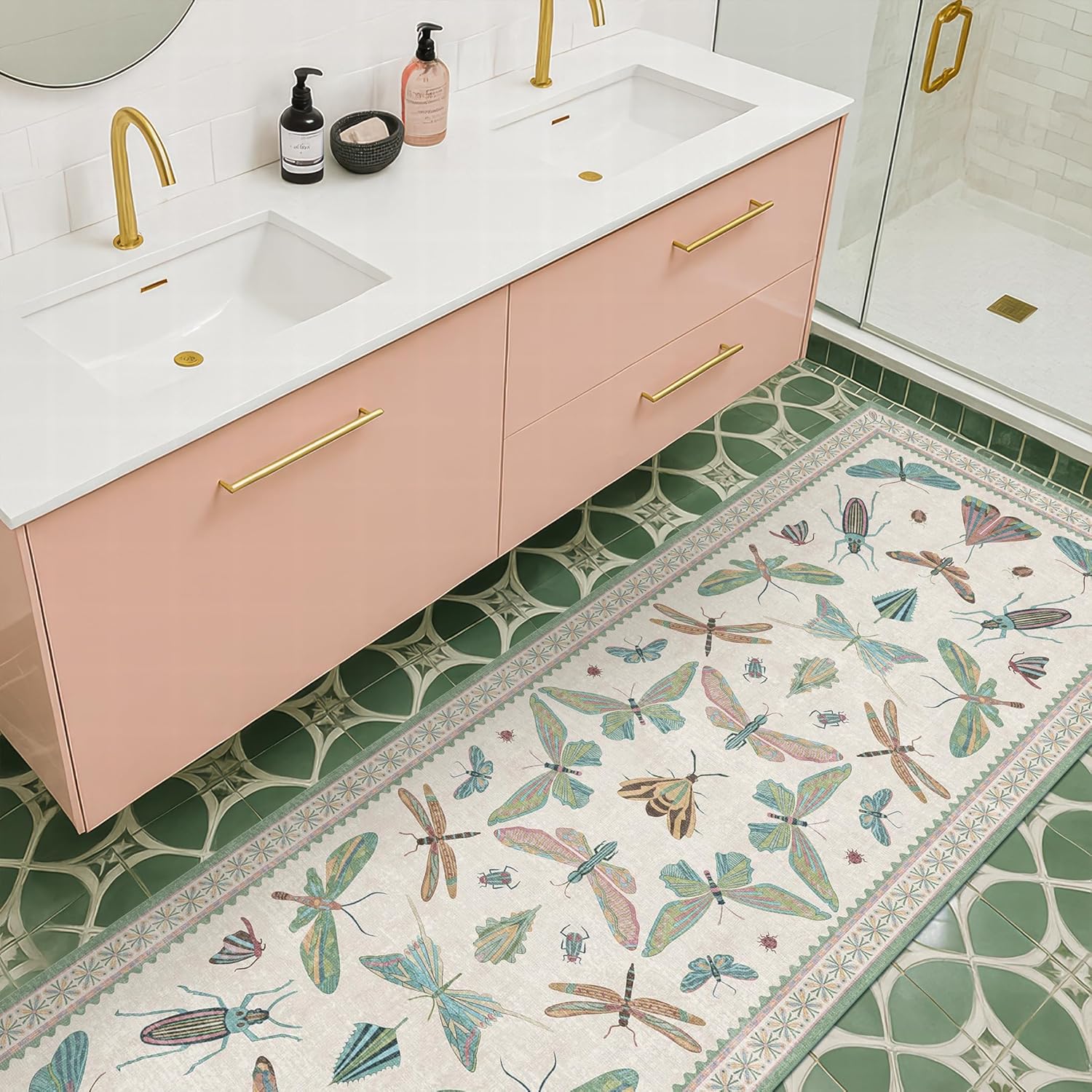 Boho Bathroom Runners - 2x6 Blue and Green Rug for Kitchen, Entry Way, Non Slip Washable Butterfly Insect Print Home Decor