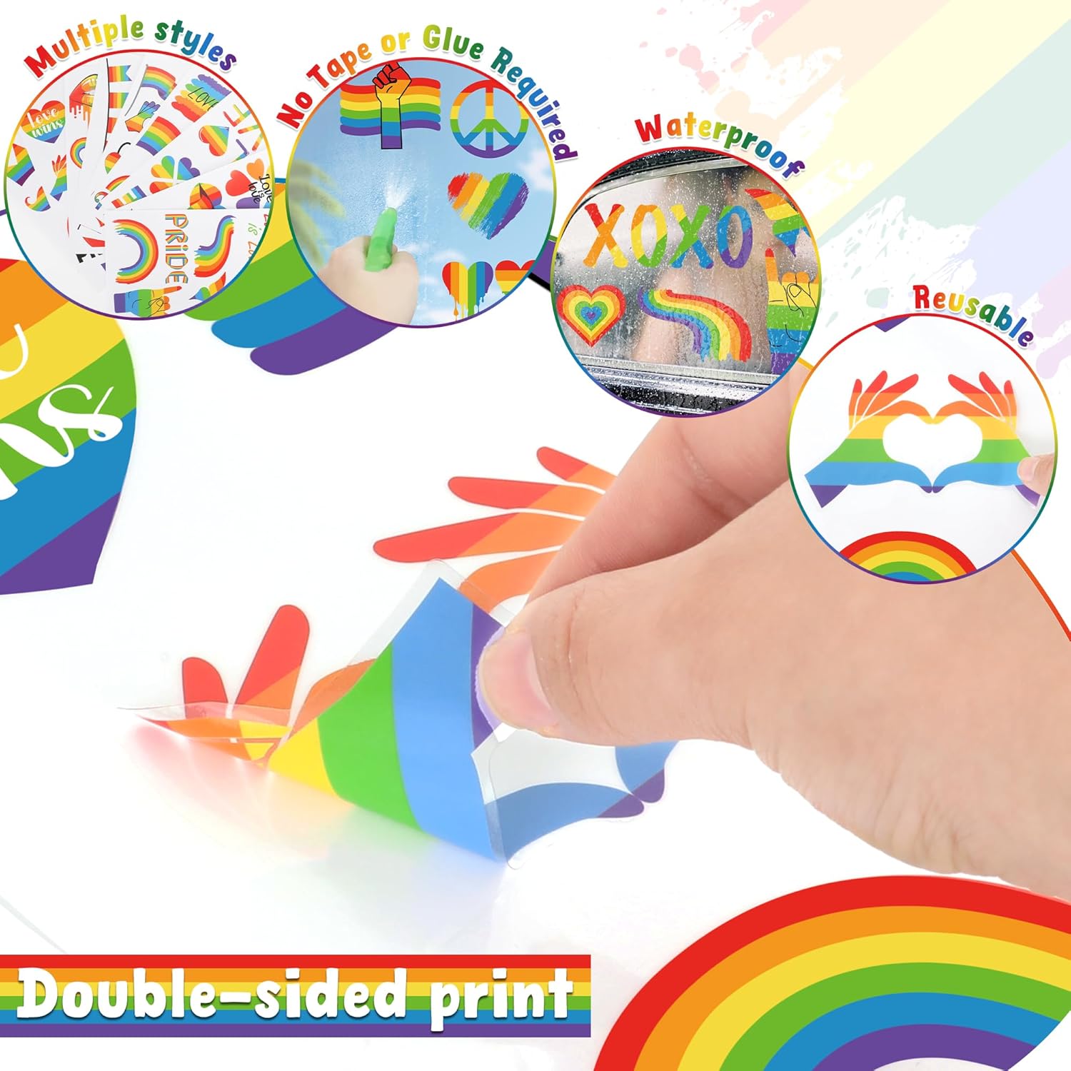- Pride Window Cling Set - Get 58 vibrant, reusable LGBT window clings, each measuring 7.87"x11.81". Made from waterproof, safe material, these rainbow window stickers are fade-resistant for indoor/outdoor use and serve as pride window stickers for birds.