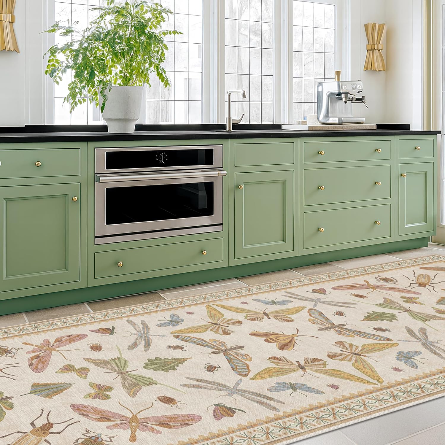 - Whimsical Nature-Inspired Design: Celebrate the wonder of the natural world with this charming insect-themed washable area rug. A neutral beige background provides a soft canvas for an intricate array of butterflies, dragonflies, beetles, and moths—arranged in playful symmetry. The muted tones of sage green, golden mustard, dusty blue, and blush rose lend a vintage botanical feel, while the hand-illustrated look evokes the feel of antique, cottagecore, eclectic entomology prints