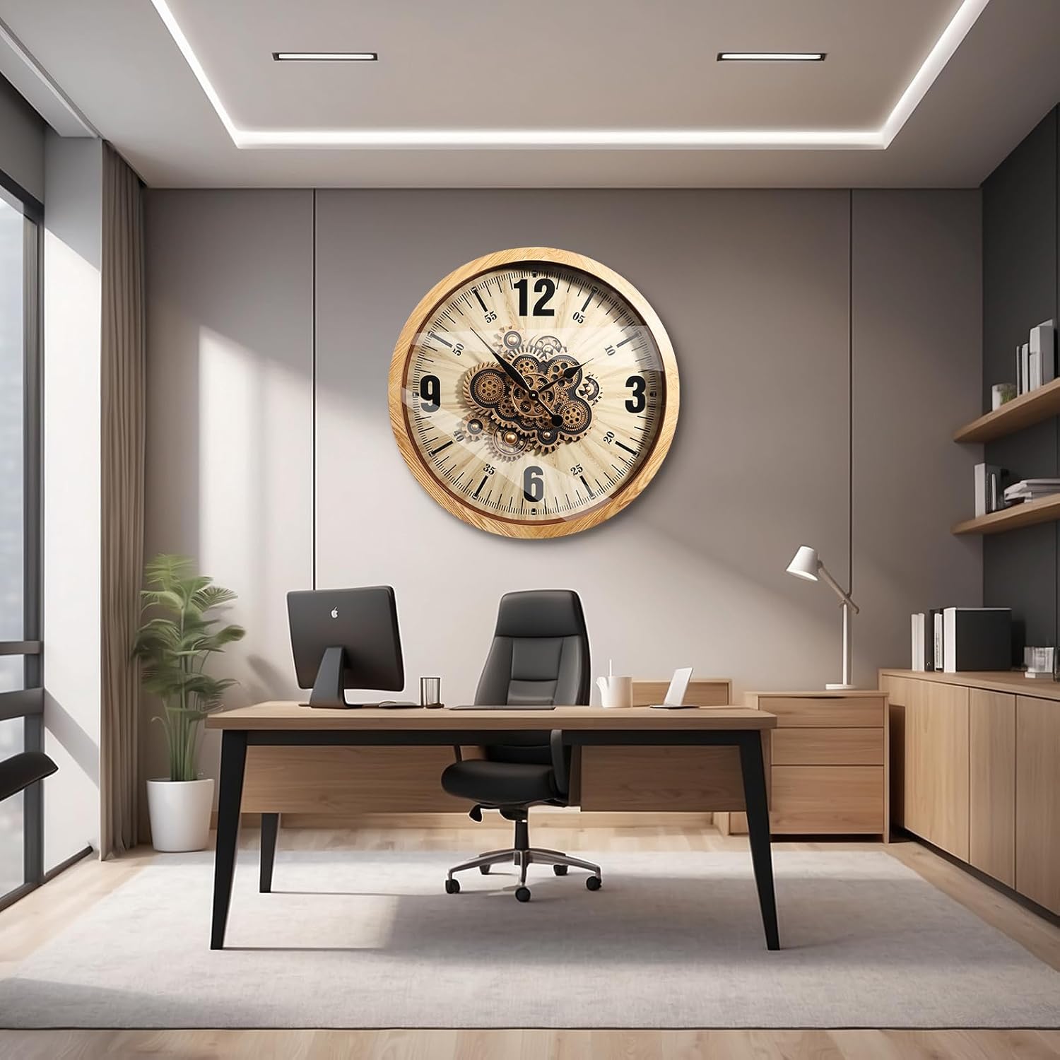 - Easy to Read and Hang: 27" Diameter *3.15" Thick/68*8 cm, big Arabic Numerals is easy to read from a long distance. This office décor clock made of high-quality wood, HD glass-Clear glass lens protects the clock face from dust. Requires 1 AA for clock operation; 2 additional AA for moving gears, Gears move independently of hands ,battery not included; Keyhole for hanging is in the back included