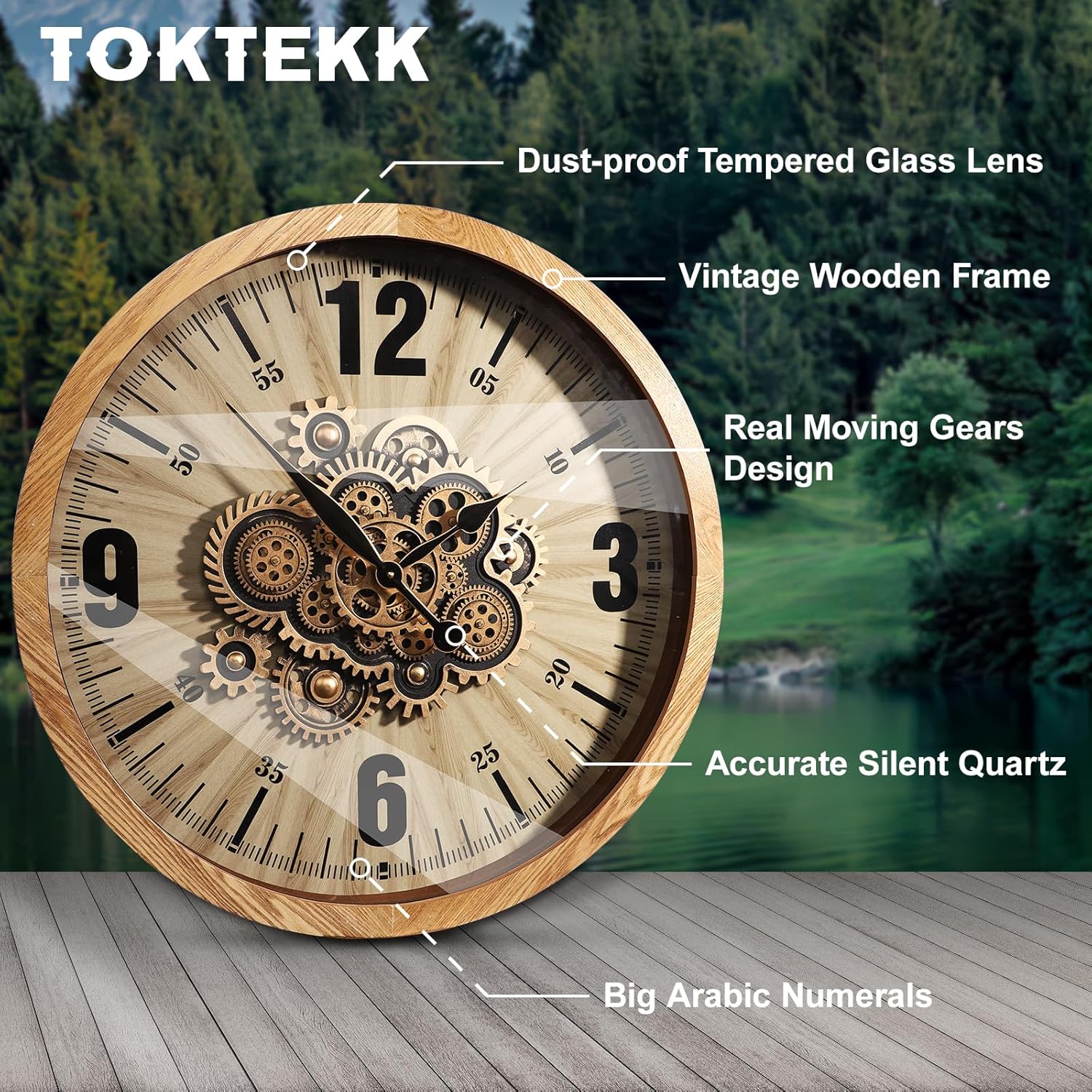 Wall Clocks for Living Room Decor, Large Real Moving Gears Clock, Vintage Industrial Oversized Rustic Farmhouse Kitchen Office Fireplace Wall Decor (Wood Tone, 27 inch)