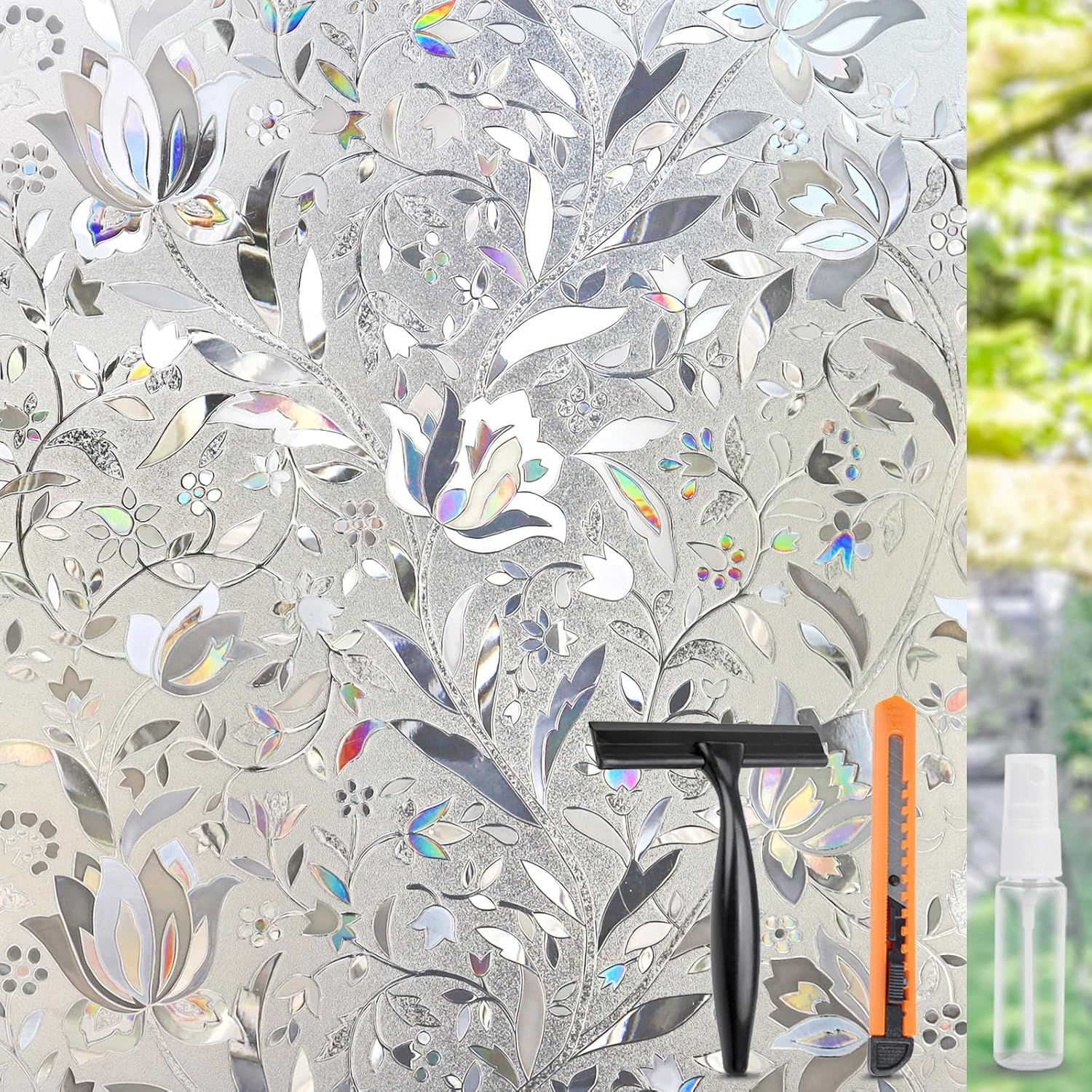 HIDBEA Window Privacy Film, 3D Stained Glass Static Cling - Sun Blocking Anti-UV Heat Control, Reusable Decorative Film for Home/Office Doors, Rainbow Tulip Design (35.4 in x 78.7 in)