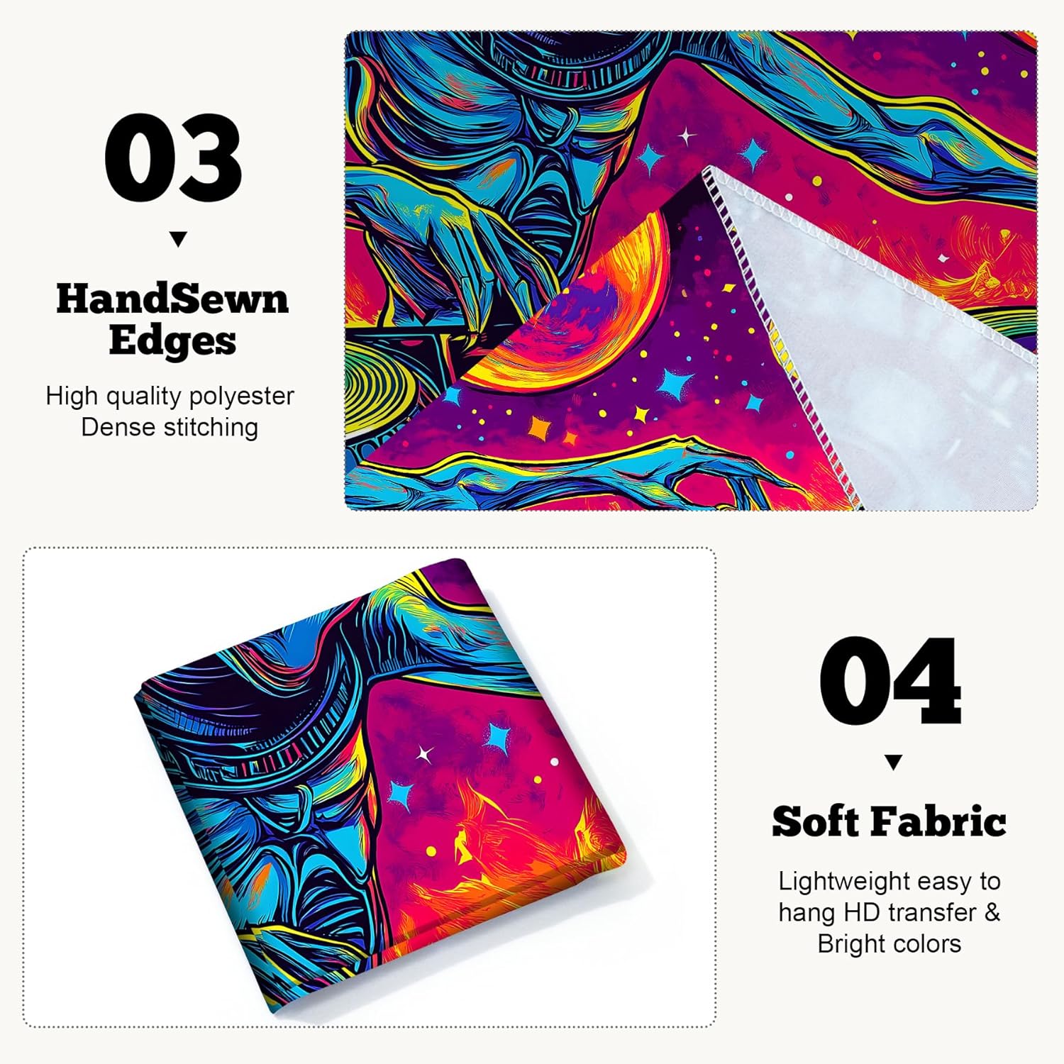 - Tapestry Material: This psychedelic tapestry is made of decent quality polyester fabric, soft touch and durable, fast drying and non-fading.
