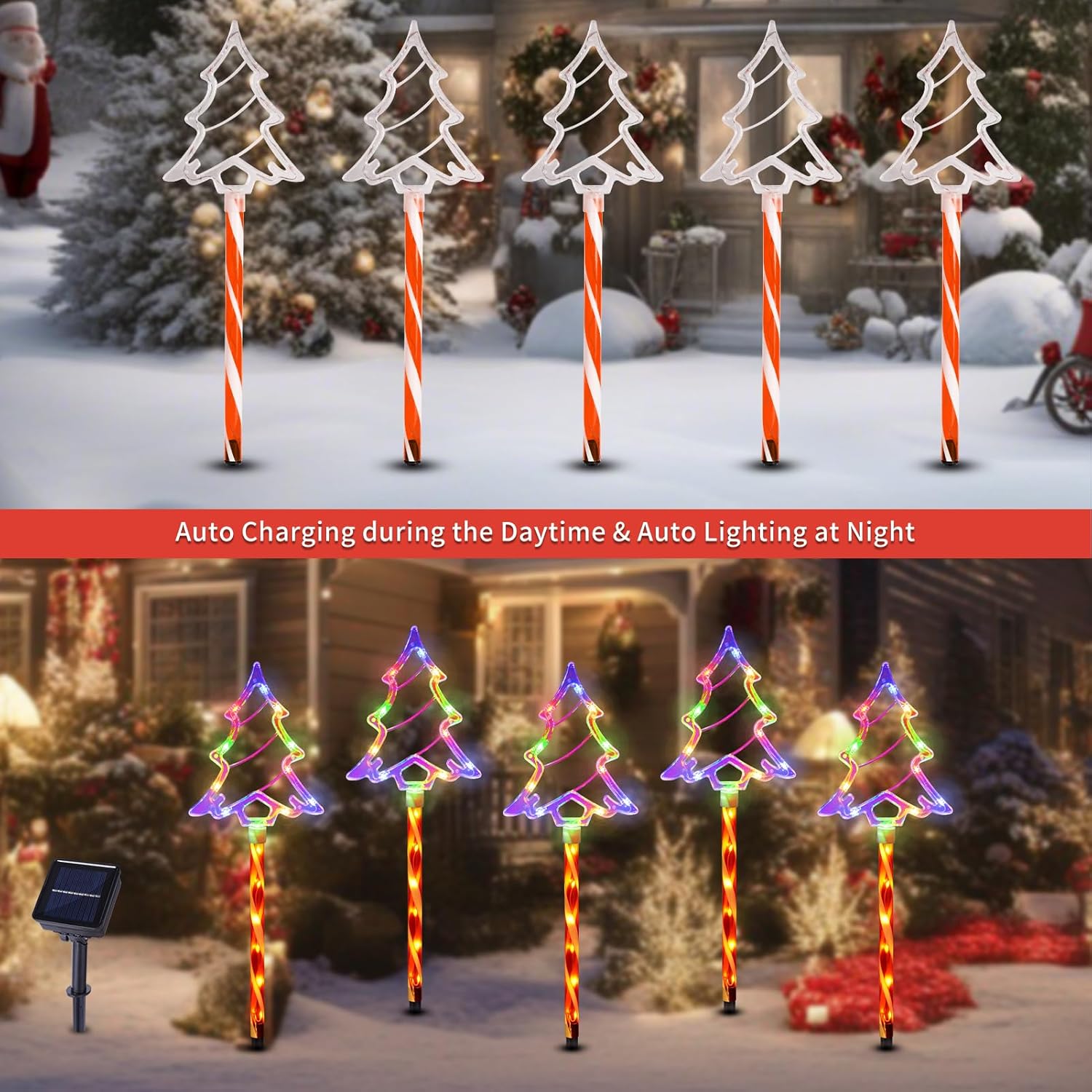Christmas Solar Pathway Lights Outdoor Decorations, 8 Modes Xmas Tree Candy Lights Waterproof Led Garden Stake Light for Walkway Yard Lawn Porch Holiday Decor 5-Pack (Multicolor Tree, 10 Pack)