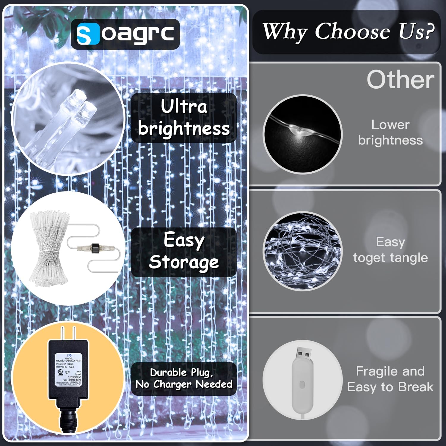 - Upgraded Durability for Everyday Use - Soagrc curtain string lights are crafted with enhanced copper wire and high-quality LEDs to ensure stronger durability. Tangle free and stable, they’re ideal for everyday use from dressing up your bedroom wall to adding a soft glow behind your reading nook or vanity mirror