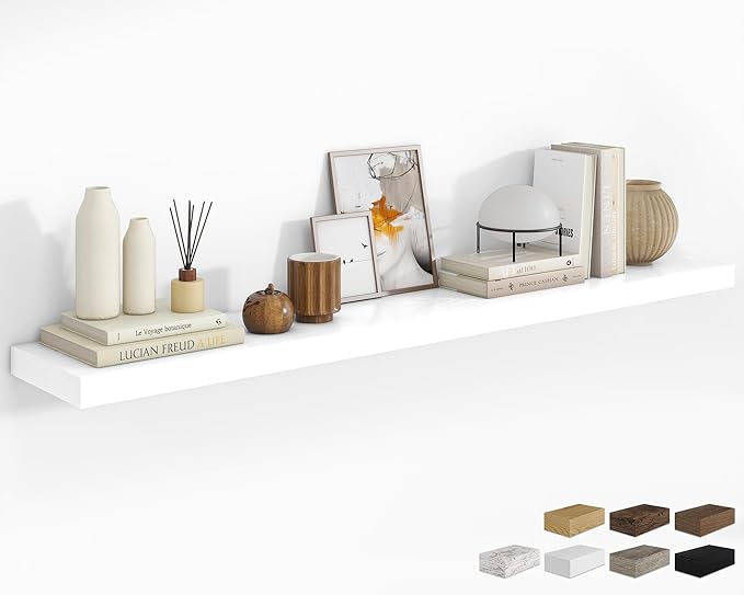 - 72 Inch Floating Shelves for Wall (Set of 1): Each wall shelves are 8 inches in depth and 1.5 inches in thickness. Our wall shelf can be used in combination, staggered high or low on the wall, or mounted side-by-side to provide extra storage space for organizing small items and clutter in multiple areas such as kitchens, bathrooms, and bedrooms, creating a clean and smooth look. Multiple colors available