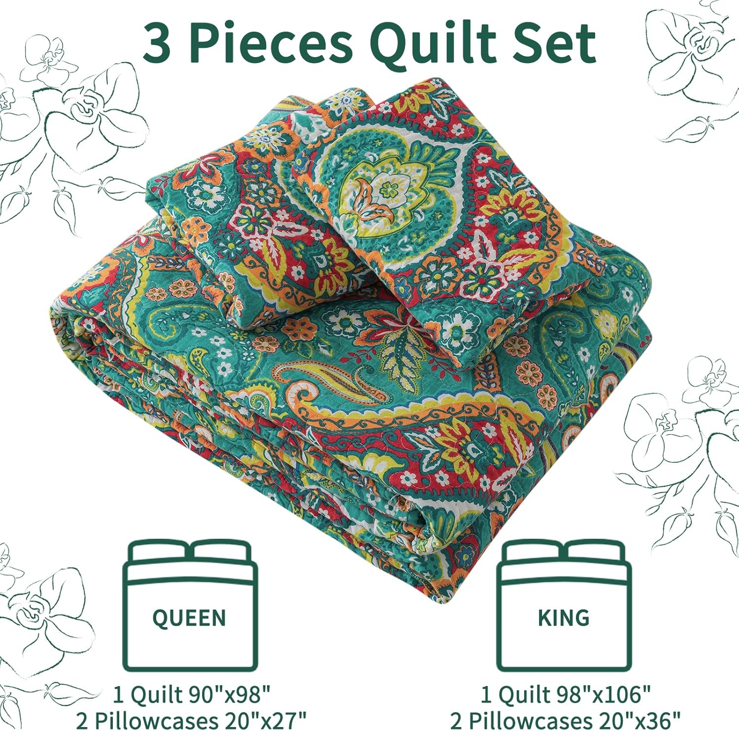 VAPUTAR Cotton Bedspreads Queen Size with Floral Pattern, 3 Pieces Soft Lightweight Reversible Quilted Bedspread Coverlet(90*98 inch), Farmhouse Style Queen Quilt Bedding Set Suitable for All Season