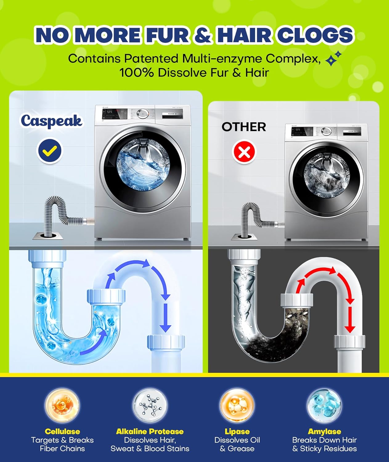 - PESKY FUR? LET OUR ENZYME FORMULA HANDLE IT - Caspeak pet hair dissolver for washing machine contains patented multi-enzyme complex. It targets fiber chains in pet and human hair, breaking them down and 100% dissolving them. Specially made for pet families, Caspeak laundry cleaner dissolves quickly and leaves no chemical residues behind — safe for both pets and humans. Say goodbye to pet fur clinging to your clothes after every wash!