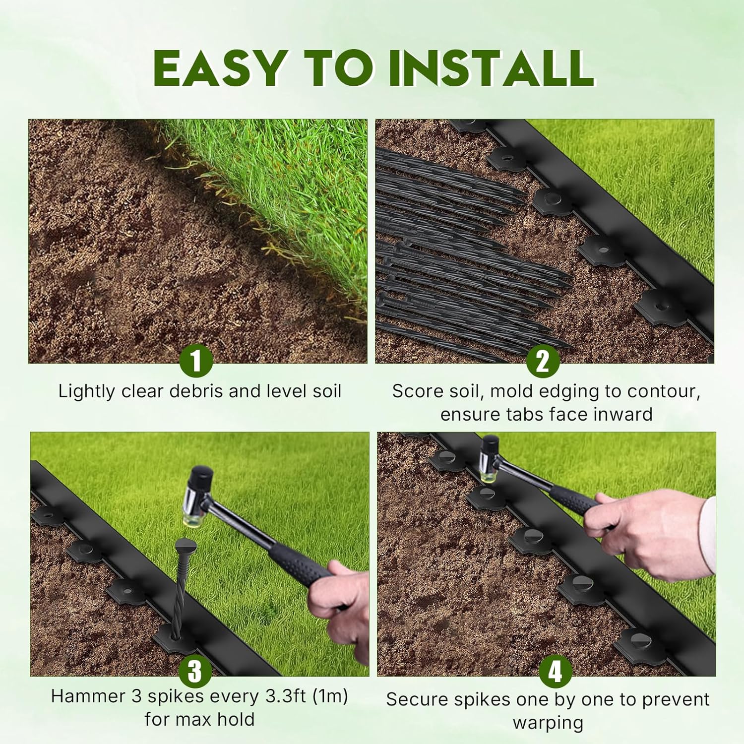 - Family Essential]Each set includes: 1 roll of landscape edging (2in * 66Ft), 200 anti detachment spiral nails (galvanized and rust proof treatment), 1 glove and 1 engineering rubber hammer (ergonomic handle). Professional tip: Lay flat in sunlight for 2 hours before installation to eliminate curling memory. It is recommended to use extended ground nails for snow construction. Sandy soil requires shortening the nail spacing to 10 inches.