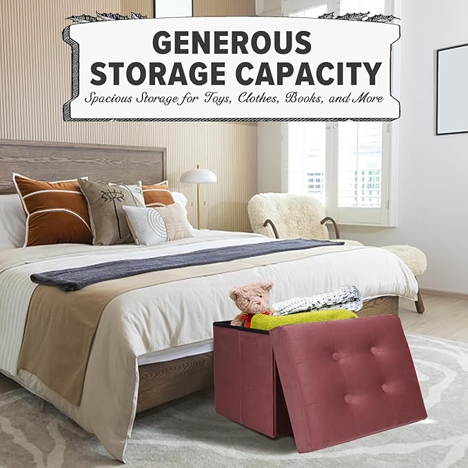 - 【Large Storage Space】 It is made of high quality fiberboard frame, so you can sit on it with confidence. It's perfect for your bedroom or living room. Whether used as a under desk foot rest or as living room storage, this ottoman foot rest provides maximum comfort. The velvet folding footstool serves as a ottoman with storage for living room to store Christmas gifts and children's toys, blankets, cushions, books and sports equipment. It helps to keep the room organized and neatly hide clutter