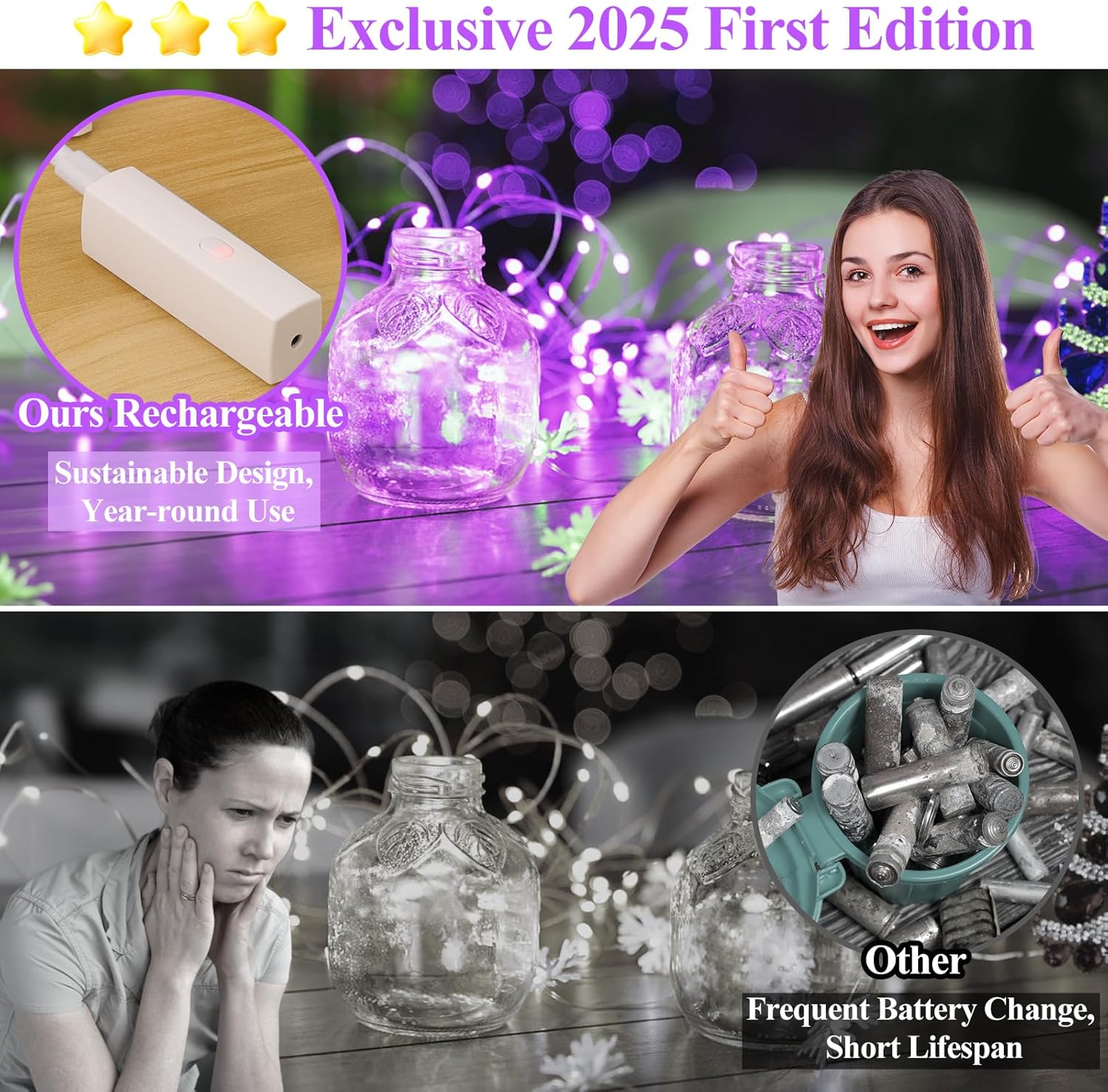 - 2025 Specially Developed Battery Operated String Lights: Say goodbye to disposable batteries and embrace sustainability! Our rechargeable Type-C power bank (cable included) powers the twinkle lights for 30+ hours of cordless glow. When it’s time to recharge, simply detach the compact, lipstick-sized power bank—no need to move the entire string lights. Designed with an innovative, patented structure, this power bank offers a smarter, greener way to shine