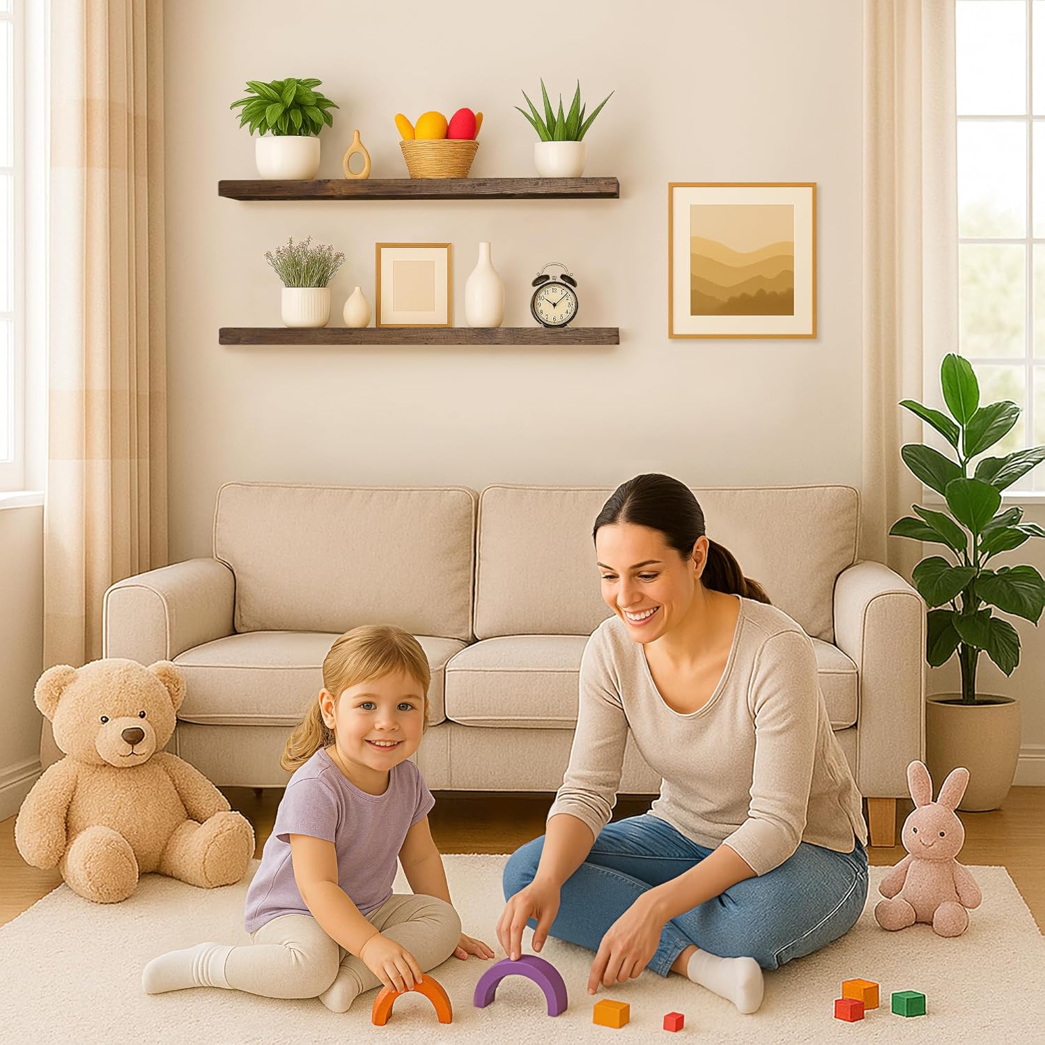 - MULTIFUNCTIONAL DECORATIVE SHELVES: Modern rustic style floating wall shelves are suitable for a variety of scenarios. Use it in the kitchen to store spices, bottles, cups; install it in the bathroom to store shampoo, conditioner, body wash and more. Also perfect for bedroom, living room, office, etc., beautiful and space-saving