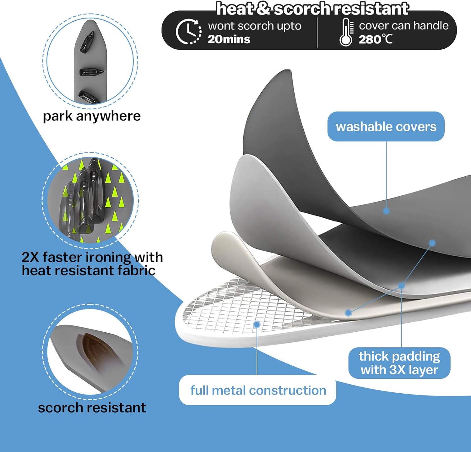 - 【Smooth-Surface Metal Mesh】The small ironing board with reinforced metal mesh ensures fast heat distribution for efficient ironing. Adjustable non-slip TRP feet protect floors and keep the board steady on uneven surfaces, while the breathable design prevents heat buildup.